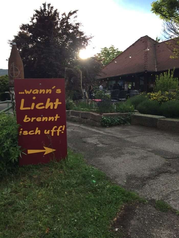 Im Sommer können wir uns neben den heißen Tagen auch auf laue Nächte freuen, in denen es noch lange hell ist und man draußen sitzen und die Seele baumeln lassen kann! Einer meiner Favoriten, wo man genau das kann, ist der Weinpavillon vom Weingut Bernhard Koch in Hainfeld, auch bekannt unter dem Namen „Wann’s Licht brennt isch uff!„. Ein Schild mit ebenjener Aufschrift am Straßenrand weist Euch den Weg. Von dort aus hat man einen wunderschönen Blick auf die Weinberge der Südlichen Weinstraße und den Pfälzer Wald. Die Getränke und das Essen bestellt man an der Theke im Inneren des wunderschönen Pavillons, der mit großen hellen Holzbalken und vielen Fenstern rundherum gestaltet ist. Geschlemmt wird im Sommer dann draußen im großen Außenbereich. Genießt den Abend dort bei einem guten Wein und einem der leckeren Flammkuchen (Pfälzer Flammkuchen mit Leberwurst – klingt komisch, schmeckt aber gut!) oder einer Portion Pfälzer Pommes!