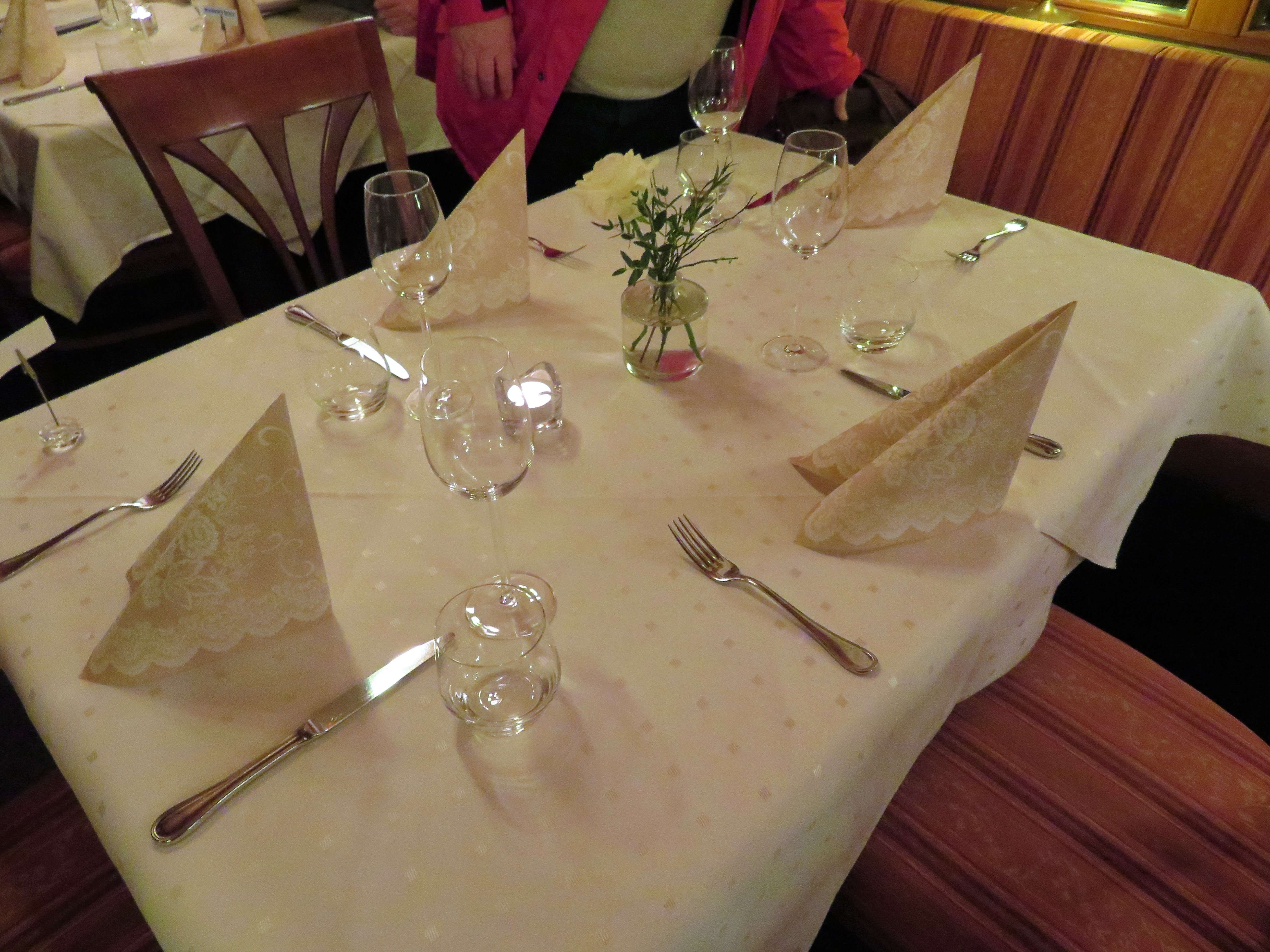 Mein Freund stellte sich sein eigenes Menü aus der Karte zusammen. Meine Eltern und ich freuten uns schon auf das „Kraut und Rüben“-Menü, das wir teilweise leicht umstellten. Meine Mama wählte die vegetarische Variante des Menüs und mein Papa und ich die für „Fleischfresser“. Allerdings lachte uns beide die Steckrübensuppe der vegetarischen Variante so an, dass wir diese anstelle des Filets vom Saibling als Vorspeise wählten. Die Weinempfehlungen zum Menü haben wir so nicht befolgt, denn kaum sehe ich einen St. Laurent auf der Weinkarte, in diesem Fall vom Ökonomierat J. Kleinmann aus Birkweiler, ist für mich alles andere passé. Meine Mama wählte den Grauburgunder vom Weingut Gies-Düppel, ebenfalls aus Birkweiler.