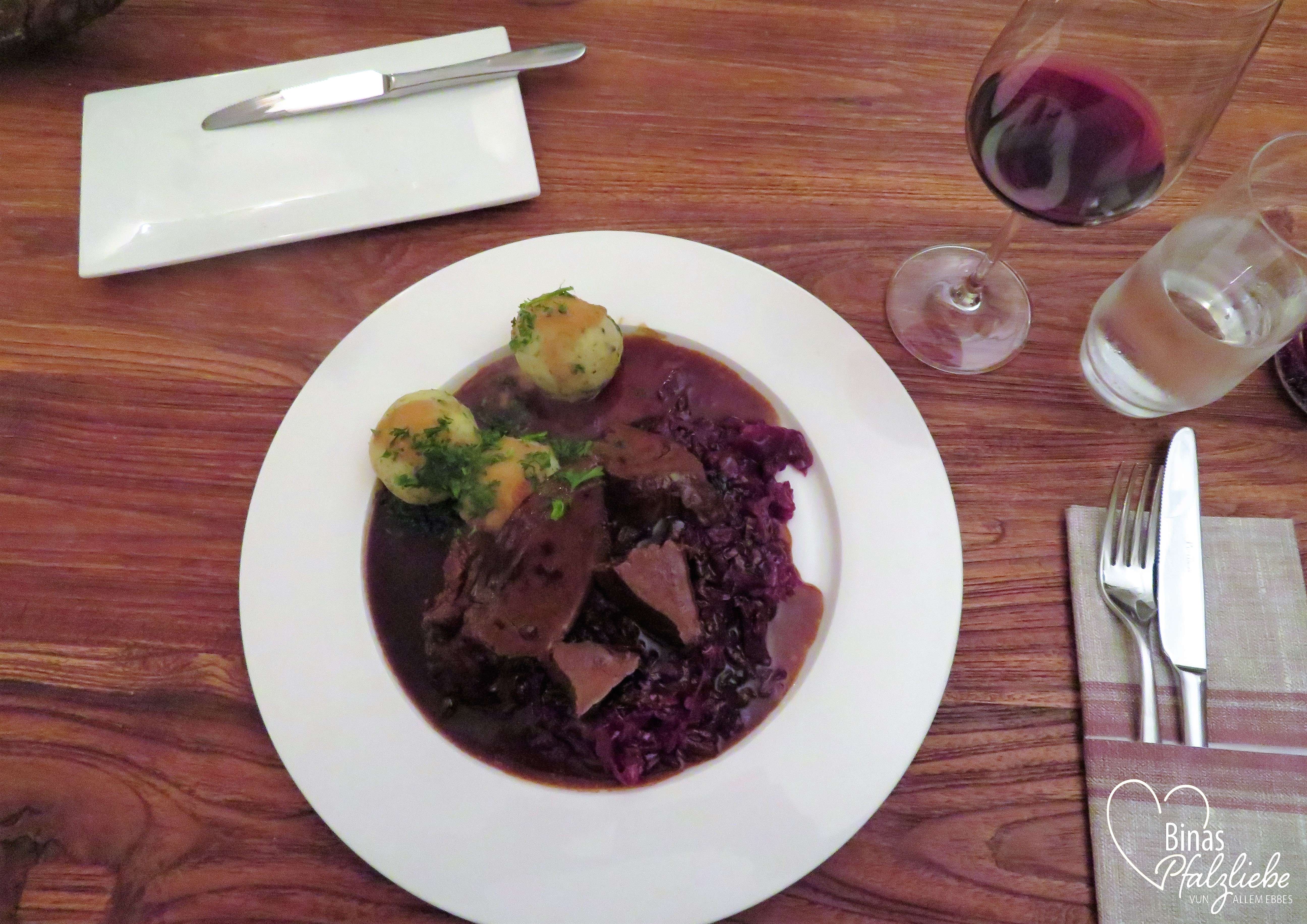 Aus der saisonalen Karte wählten wir unsere Leibgerichte des Abends. Für Nadine gab es gegrillte Lammhaxe mit Ofenkürbis und Kartoffelgratin und für mich die geschmorte Hirschkalbskeule mit Rotkohl und Schneebällchen. Letztere sind nach einem Rezept der Oma gemacht. Ich kann Euch gar nicht sagen, wie sehr ich mich freue, dass nun auch auf den Speisekarten der Herbst Einzug hält und es wieder so viele Schmorgerichte und Wildspezialitäten gibt. Wir haben es uns schmecken lassen und zum süßen Abschluss gab es noch eine Portion Arme Ritter mit Rotweinzwetschgen und Vanilleeis für jeden. Genuss pur und eine tolle Restaurant-Empfehlung meiner lieben Blogger-Kollegin!
