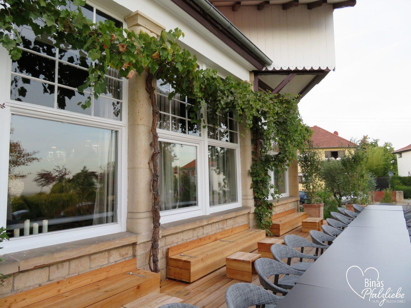 Im Außenbereich fällt einem gleich die schöne Holzterrasse auf, von der aus man den Blick über die Weinreben und die Rheinebene schweifen lassen kann. Um das Gebäude aus hellem Sandstein ranken Weinreben entlang und dank der großen Fenster lässt sich der tolle Ausblick auch von innen genießen.