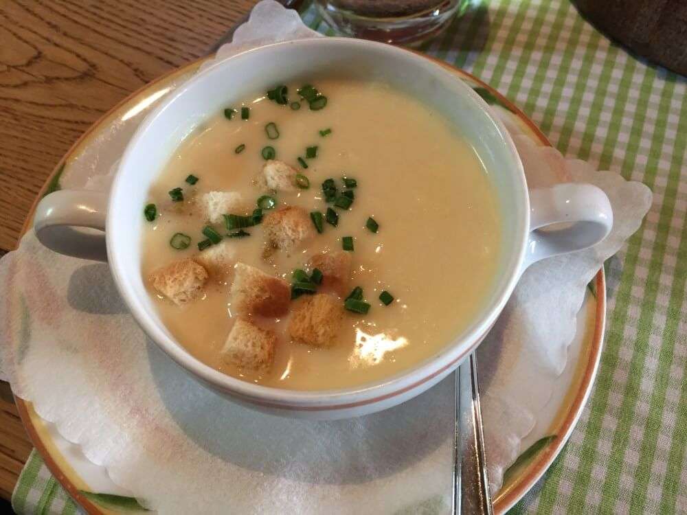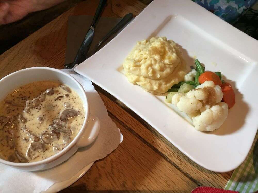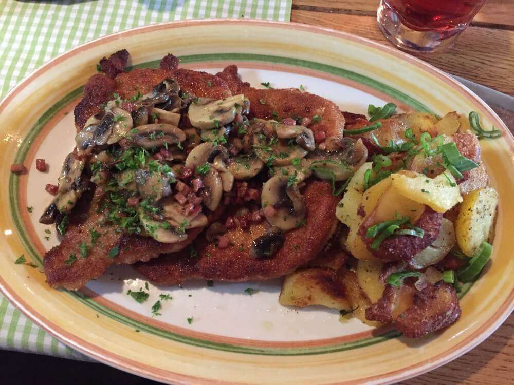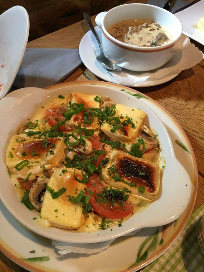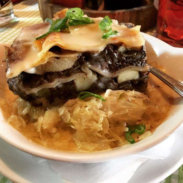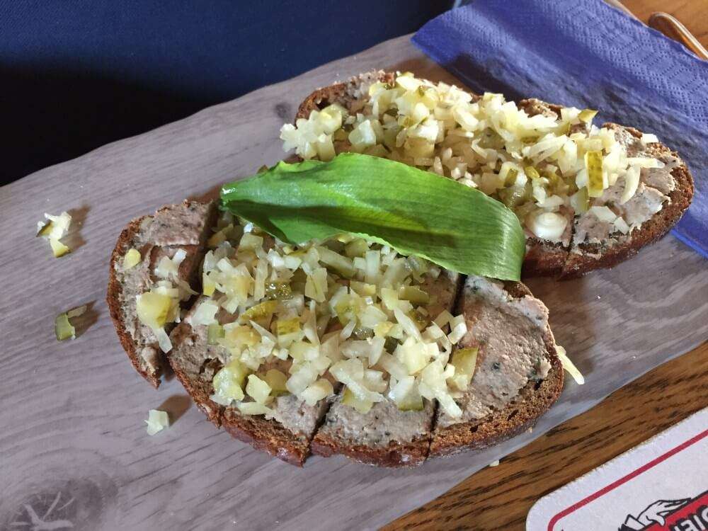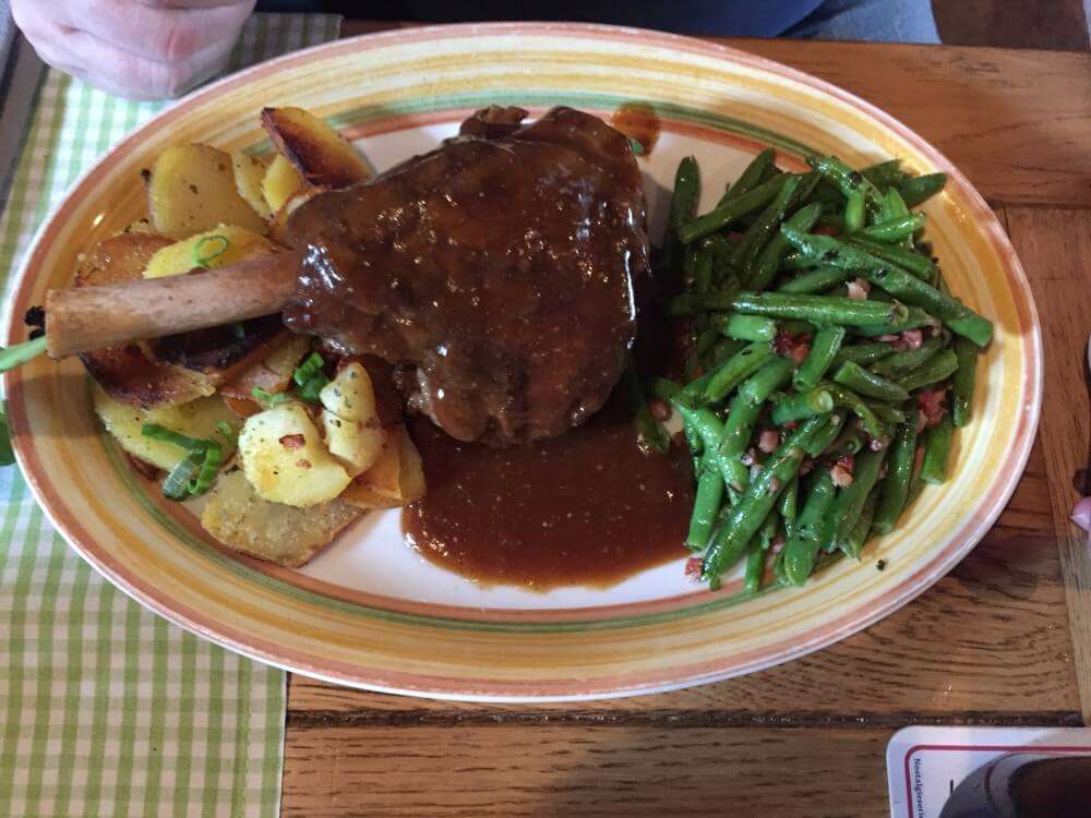 Vielleicht hat der ein oder andere von Euch es schon auf meinem Instagram Account (@binas_pfalzliebe) gesehen. Bereits der Gruß aus der Küche, selbstgemachte Rotweinbutter, versprach so einiges. Für die Experimentierfreudigen unter Euch, probiert unbedingt die Blutwurst-Lasagne. Die gibt es in drei Portionsgrößen, so dass man sich auch vorsichtig an das Ganze herantasten kann. Auch wenn ich nicht der größte Blutwurst-Fan bin, finde ich doch, man muss es mal probiert haben. Gerade die Apfelspalten darin sorgen für den besonderen Kick. Wer es lieber traditioneller mag, kann auf Pfälzer Bruscetta (Leberwurst auf Bauernbrot) oder Muskateller-Weinsuppe zurückgreifen. Natürlich habe ich auch Fotos von unseren leckeren Hauptgerichten für Euch gemacht. Es gab: Landschnitzel mit Speck-Champignons, Dornfelder Lammhaxe, Kalbsnieren in Dijon-Senf Sauce und das vegetarische Burer Grumbeerpännel, Kartoffelscheiben mit Gemüse und Limburger überbacken. Ein Augen- und Gaumenschmaus, das sag ich Euch!