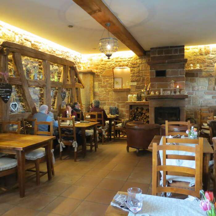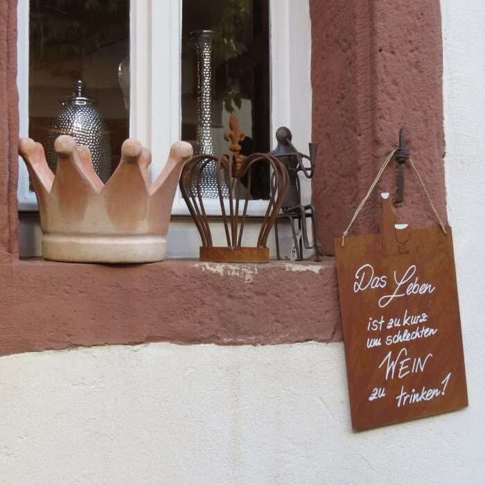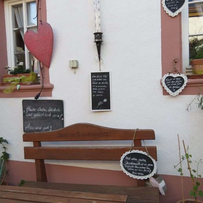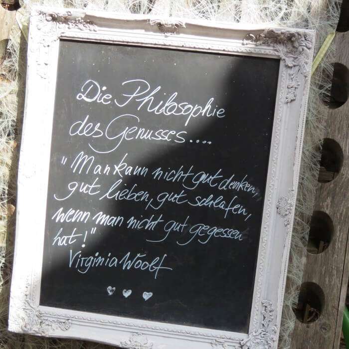 Der Hof des Weinguts Fleischmann-Krieger ist so liebevoll dekoriert, dass wir dort auf einen Pfälzer Kir, einen Pfälzer Peach (Sekt mit Brombeer- bzw. Pfirsichlikör) und ein paar Traubensaftschorlen geblieben sind. Überall im Hof hingen Schiefertafeln mit schlauen und lustigen Sprüchen über den Wein und das Leben. Darunter auch der von Virginia Woolf: „Man kann nicht gut denken, gut lieben, gut schlafen, wenn man nicht gut gegessen hat.“ – Recht hat sie! Auch im Restaurant selbst herrscht so eine heimelige Atmosphäre. Vor einer der Sandsteinwände steht ein großer Kamin mit aufgestapeltem Holz und zwei Ledersesseln davor. An einer anderen Wand befinden sich Fachwerkbalken, an denen ebenfalls viele schöne Sprüche hängen. Hier möchte ich definitiv noch einmal herkommen, denn auch das Essen auf der Karte klang sehr verlockend.