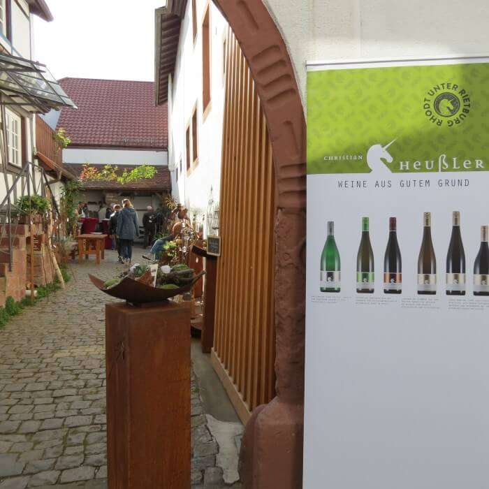 Zuletzt besuchten wir den Hof des Weinguts Christian Heußler. Dessen Logo, ein Einhorn, das schon seit 1563 Teil des Familienwappens ist, fiel uns natürlich sofort ins Auge. Zu Probieren gab es hier leckere Flammkuchenbrötchen und natürlich auch tolle Weine! Kein Wunder, denn seit dem Jahr 1750 baut die Familie Wein an und verfügt, neben viel Erfahrung, auch über 14 Hektar Rebfläche rund um Rhodt, in den Lagen Schlossberg, Klosterpfad und Rosengarten. Diese werden teilweise auch heute noch von Pferden beackert.