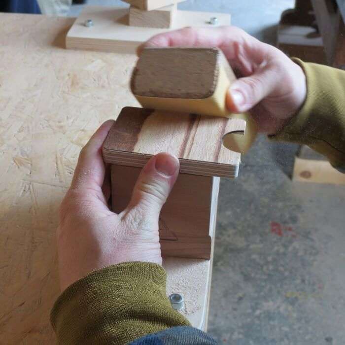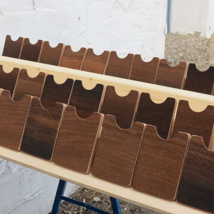 Die „Bimbesbox“ ist made in Germany und wird in Handarbeit hergestellt. Wenn der Rahmen gefräst und das Deckelmaterial mit Furnier kaschiert wurde, wird beides miteinander verleimt, beziehungsweise „verheiratet“, wie der Fachmann sagt. Dann folgt ein aufwendiger Prozess von Schleifen und Ölen, der mit Trocknungszeit auch mal bis zu zwei Wochen dauern kann. Den Webgummizug, den es auch mit Lederband gibt, stellen die beiden selbst her, bringen die Nieten an und kümmern sich um alles bis hin zur Verpackung der fertigen „Bimbesboxen“.