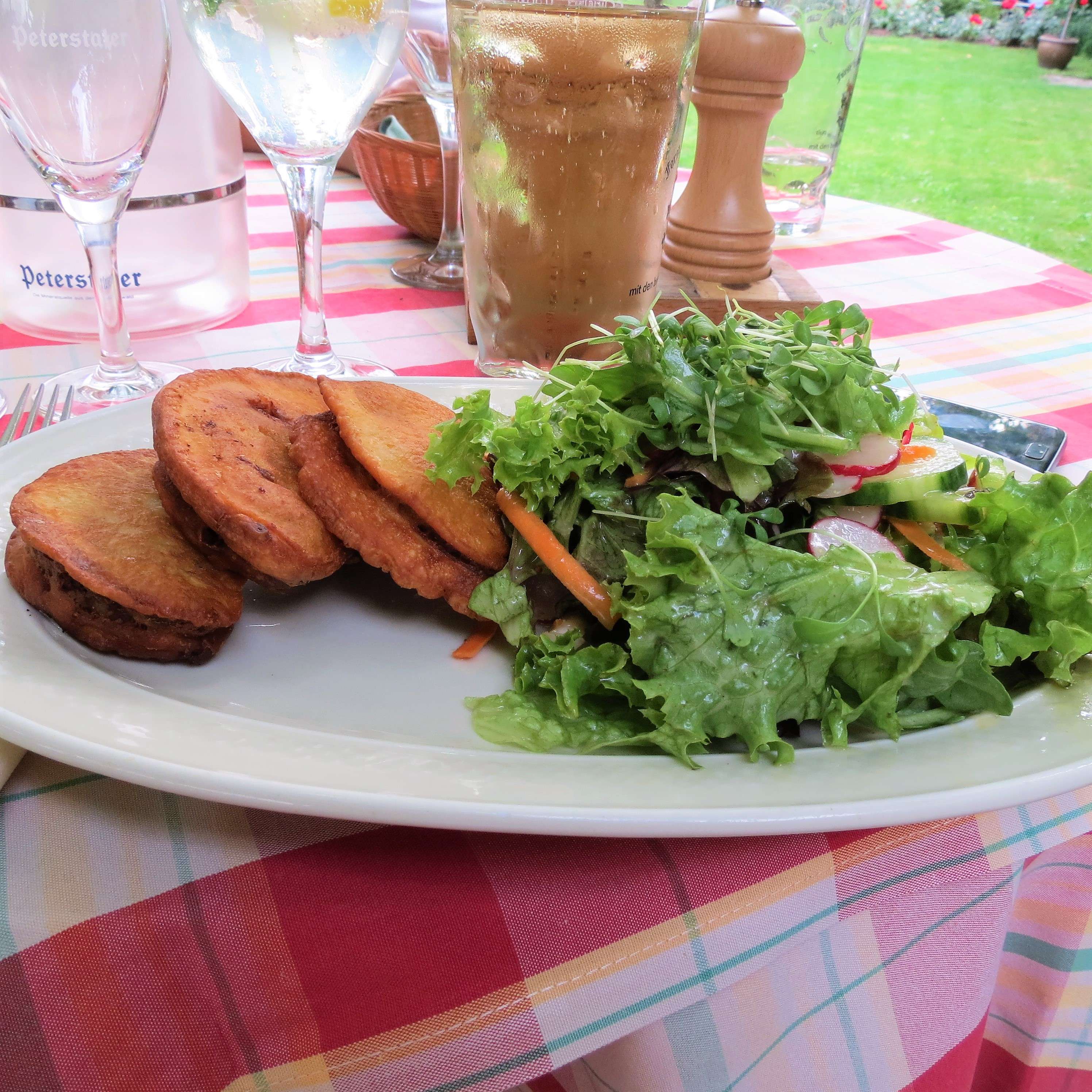 Ein leckerer Einstieg für das, was danach kam, nämlich Lammragout mit mediterranem Gemüse, Couscous und Minzjoghurt für mich und für meine Freundin einen Salatteller mit im Weinteig frittiertem Bratwurstbrät von der Metzgerei Hambel in Wachenheim. Beides ein absoluter Augen- und Gaumenschmaus! Zum Nachtisch haben wir uns dann auch noch ein Stück Rotweinkuchen gegönnt.
