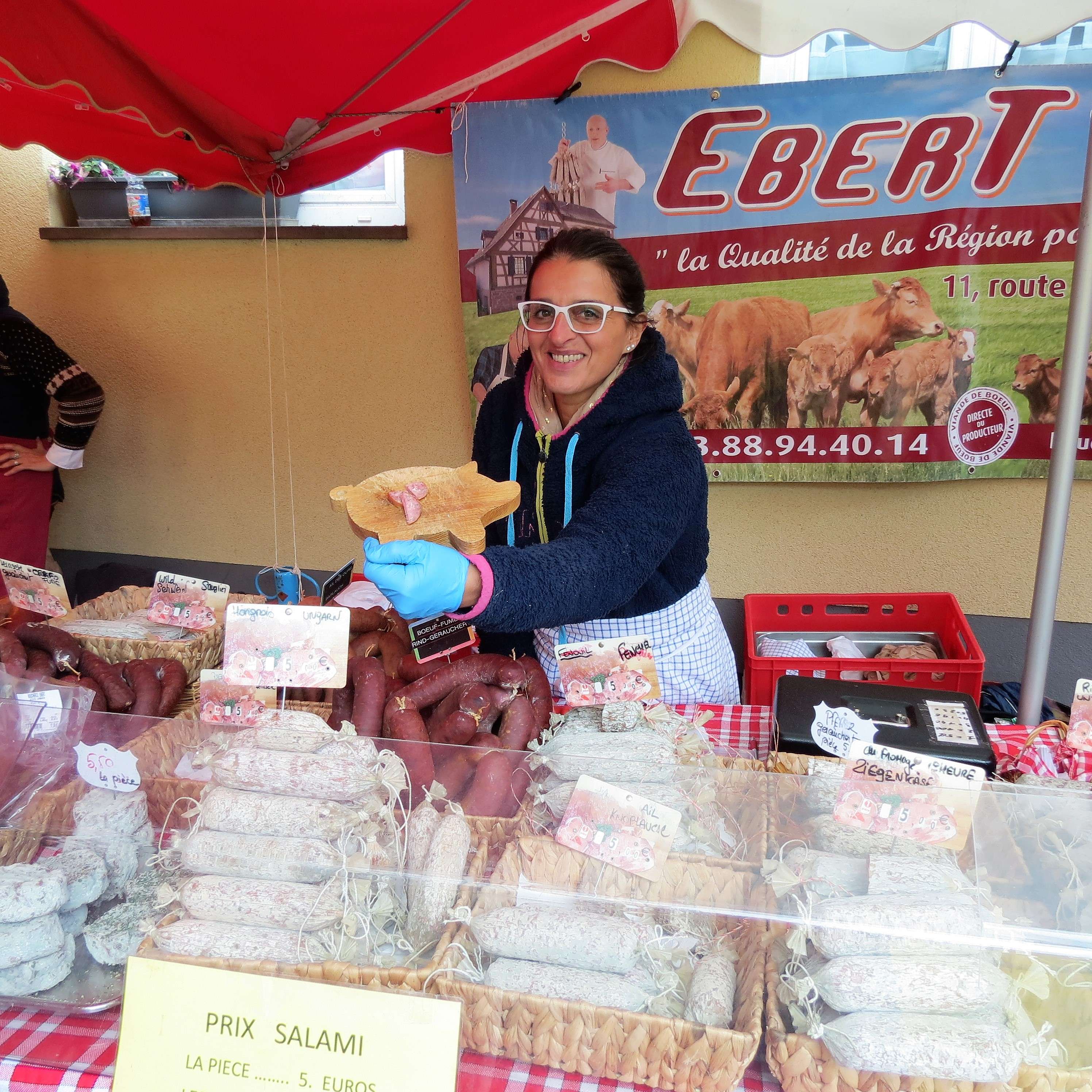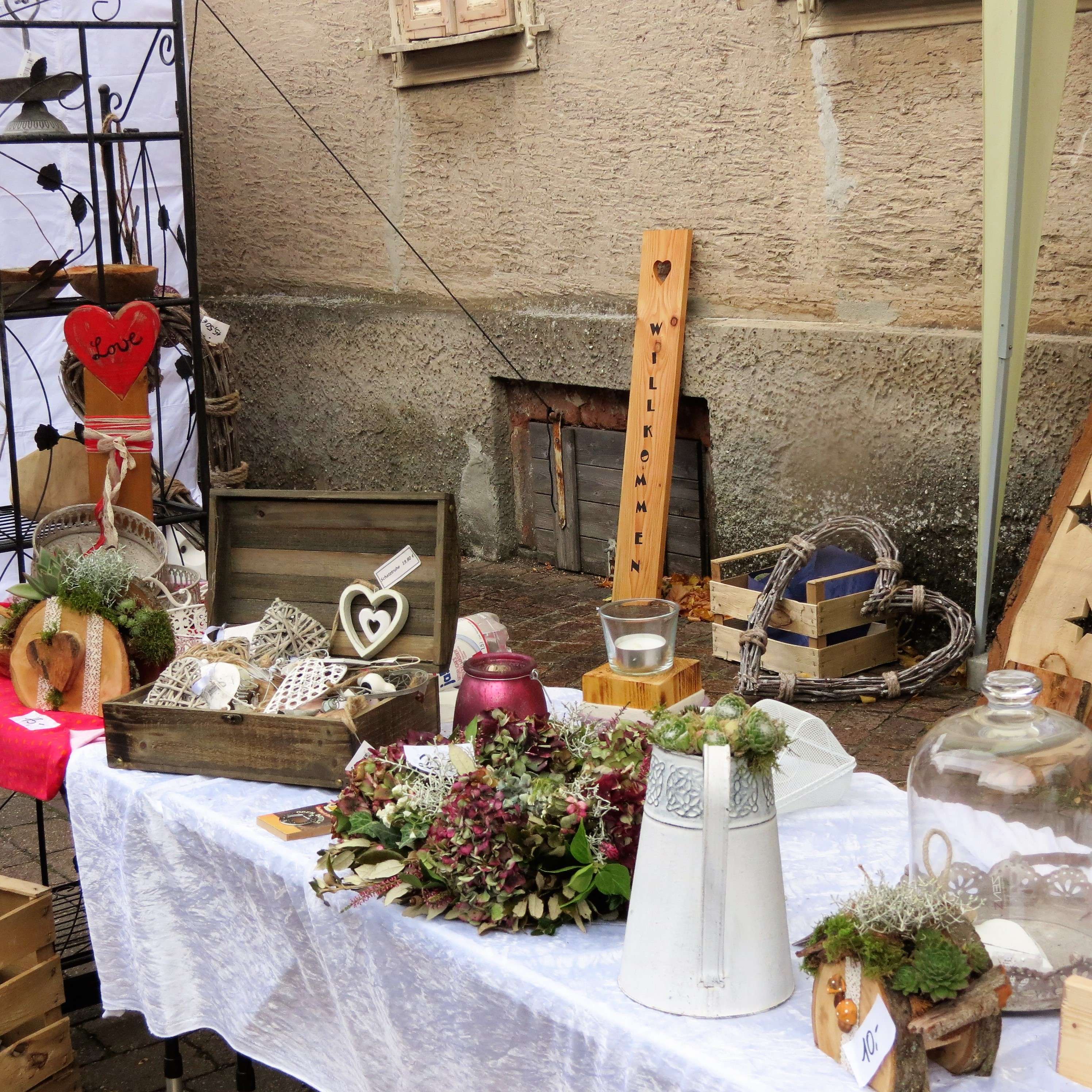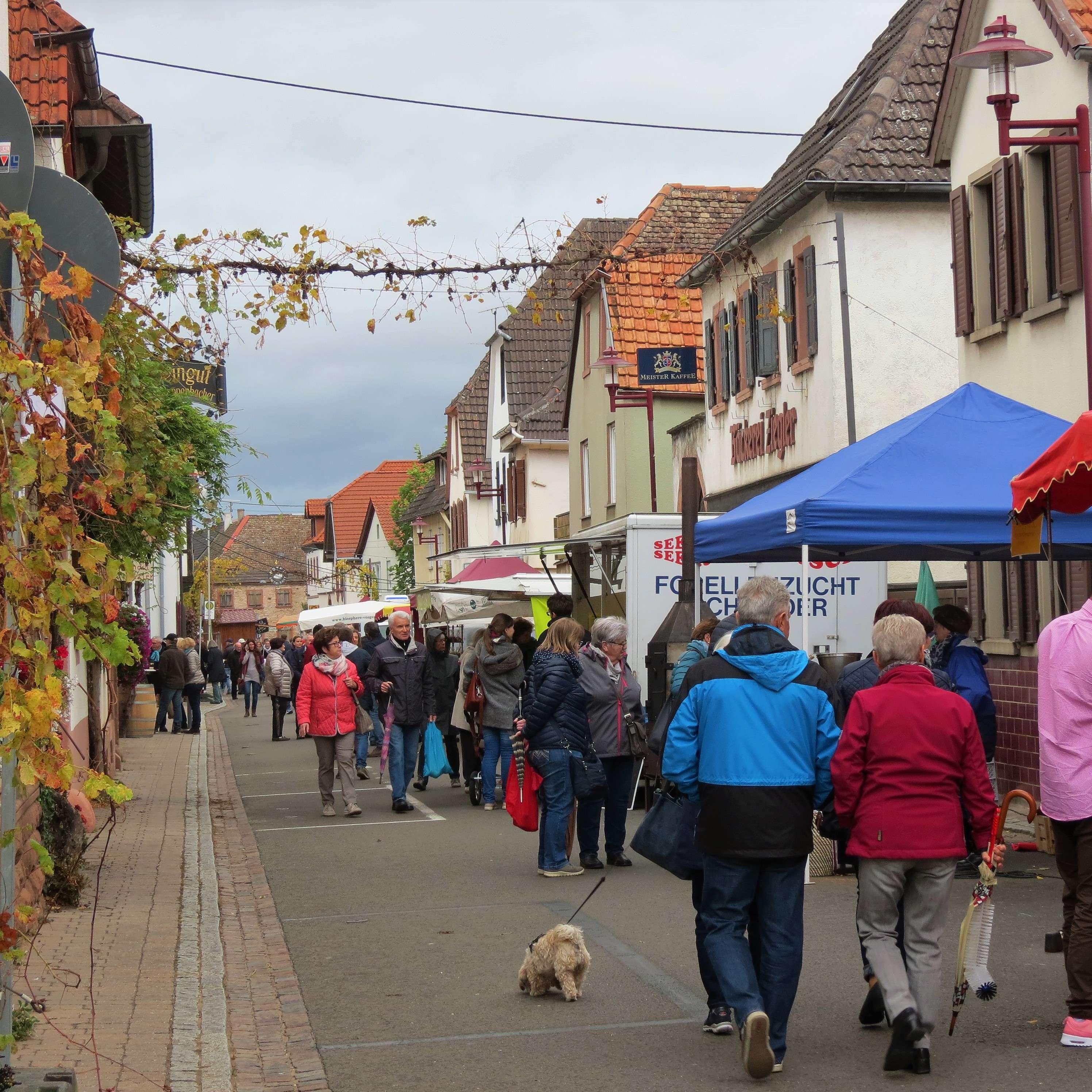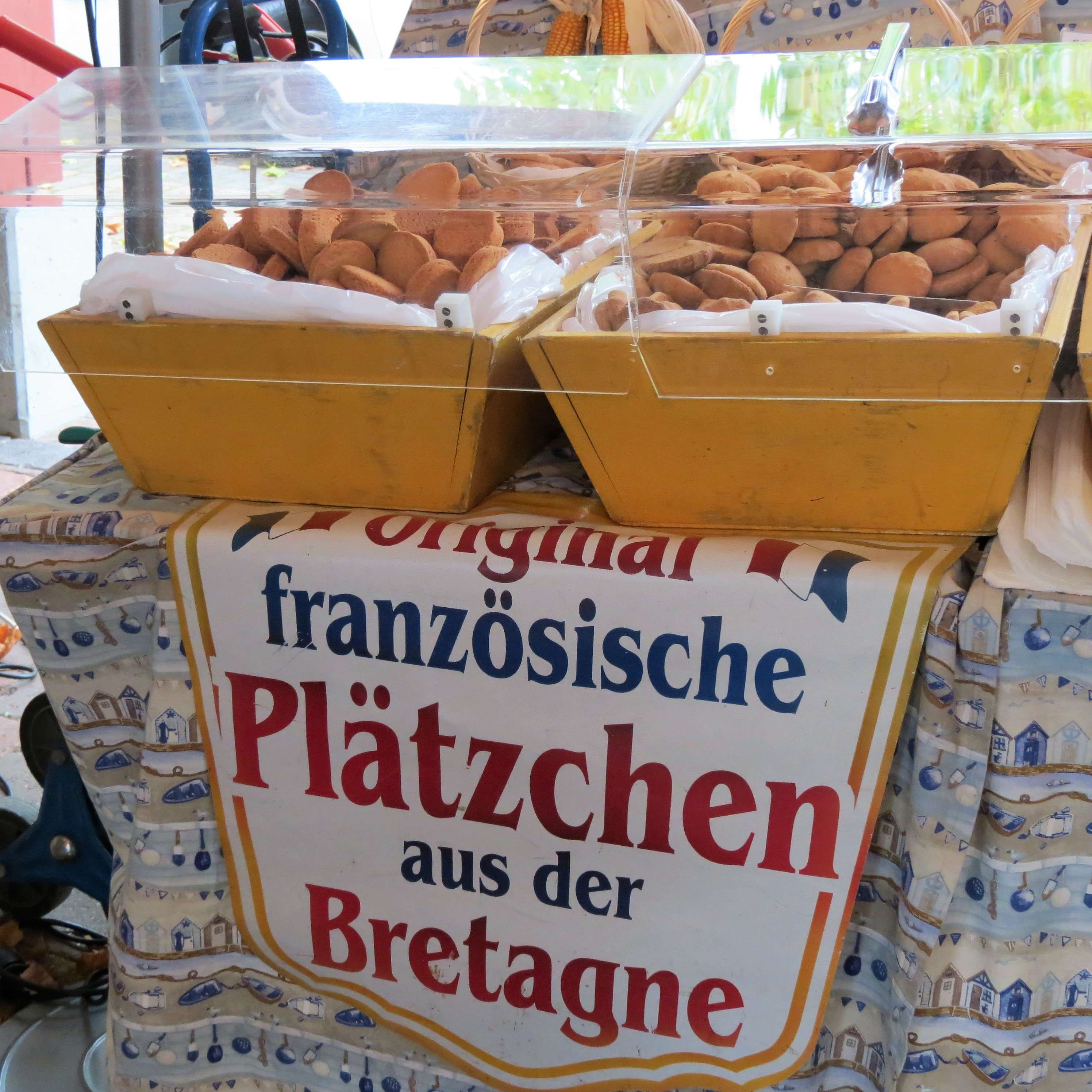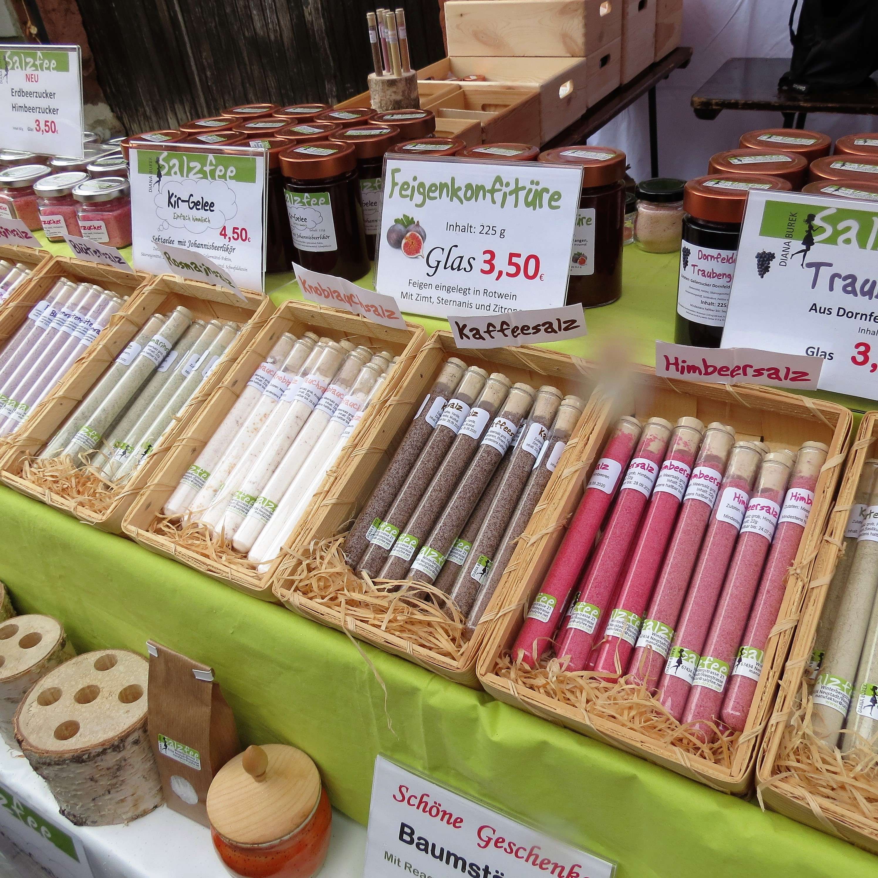 Die Stände zogen sich durch ganz Kirrweiler und trotz nasskaltem Wetter war der Markt gut besucht. Es gab Plätzchen aus der Bretagne, Essige und Marmeladen sowie Salz von der Salzfee (mein Tipp: Kaffeesalz!). Des Weiteren Obst, Gemüse, Fleisch und Wurst – von allem war etwas dabei!