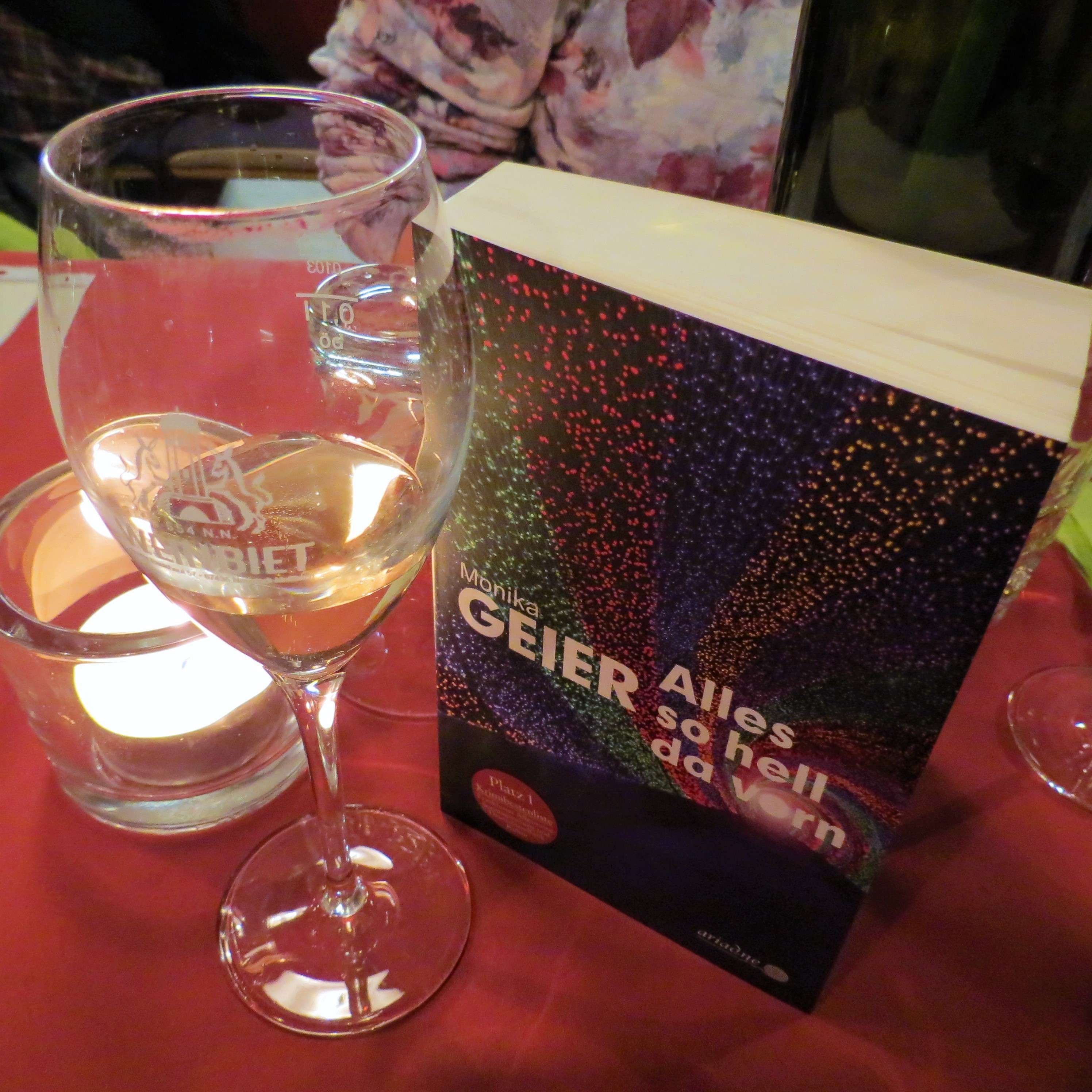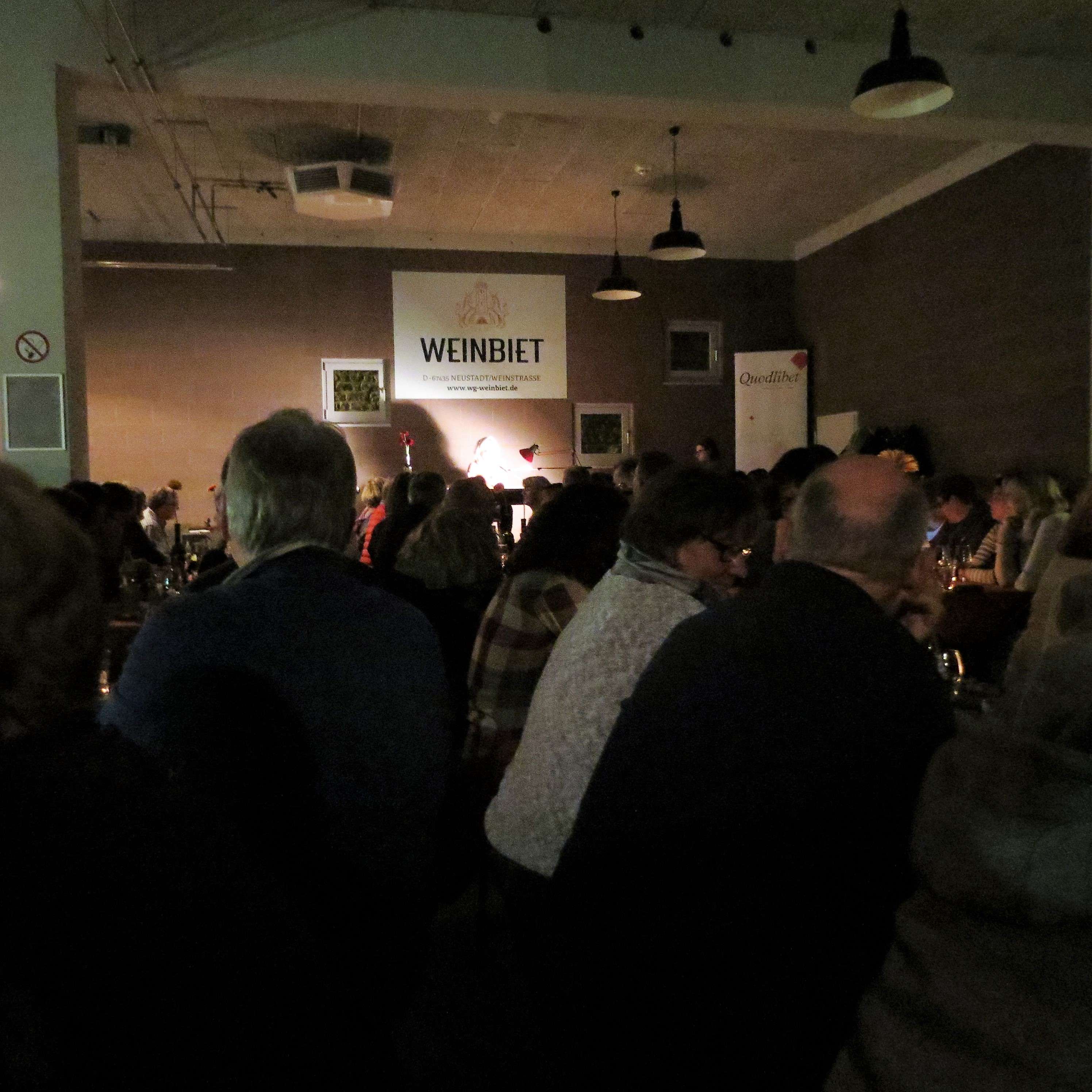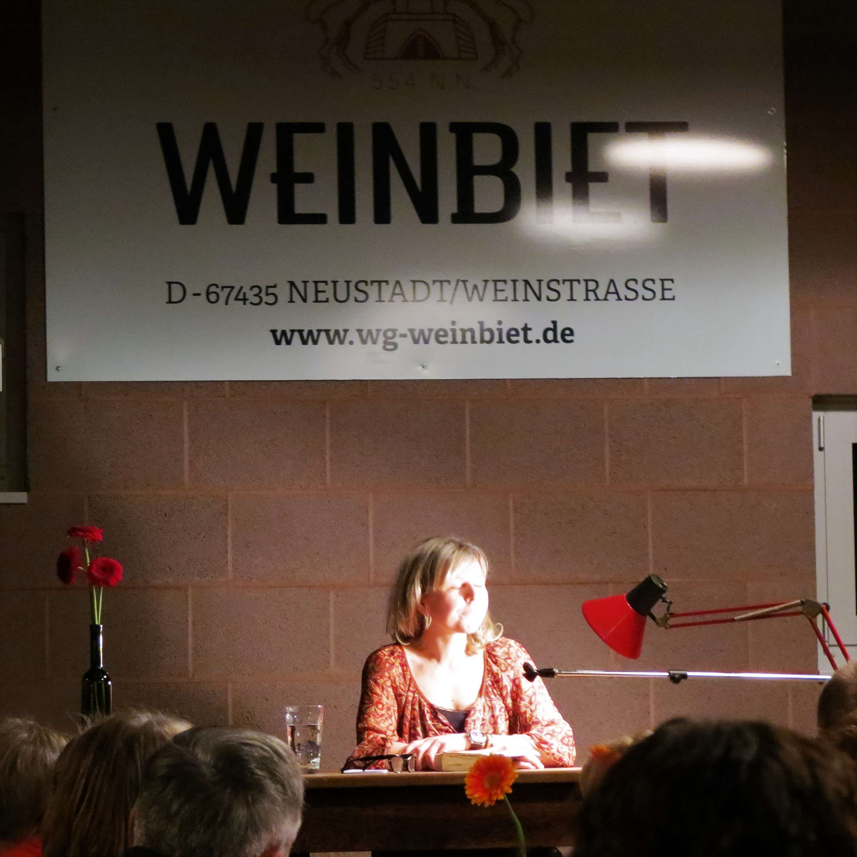 Ich war noch nie zuvor auf einer Lesung gewesen und muss sagen, es war wirklich mal was anderes. Die Veranstalter waren die Buchhandlung Quodlibet aus Neustadt und die Winzergenossenschaft Weinbiet. Das Kelterhaus war voll bis auf den letzten Platz und alle lauschten wir gespannt den Worten der Autorin. Die las einzelne Passagen aus ihrem Buch vor, gerade so viel, um einen ersten Einblick in Personen und Handlung zu bekommen, aber nie ohne die Spannung vorwegzunehmen (mehr Infos zum Buch von Monika Geier findet Ihr hier).