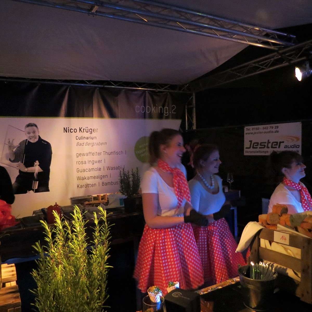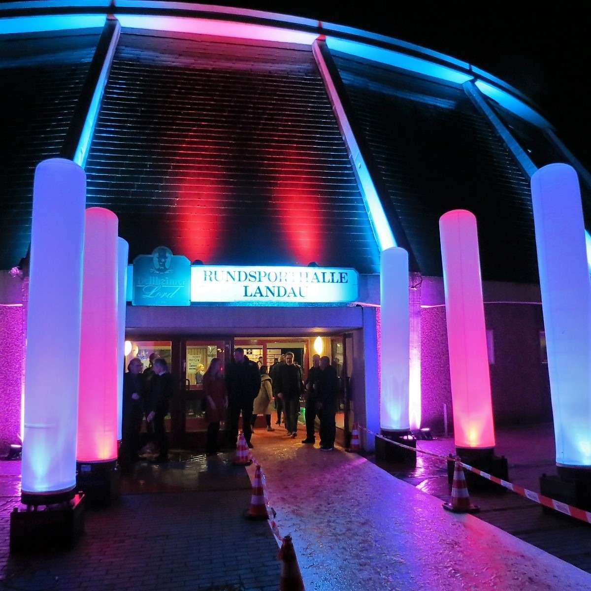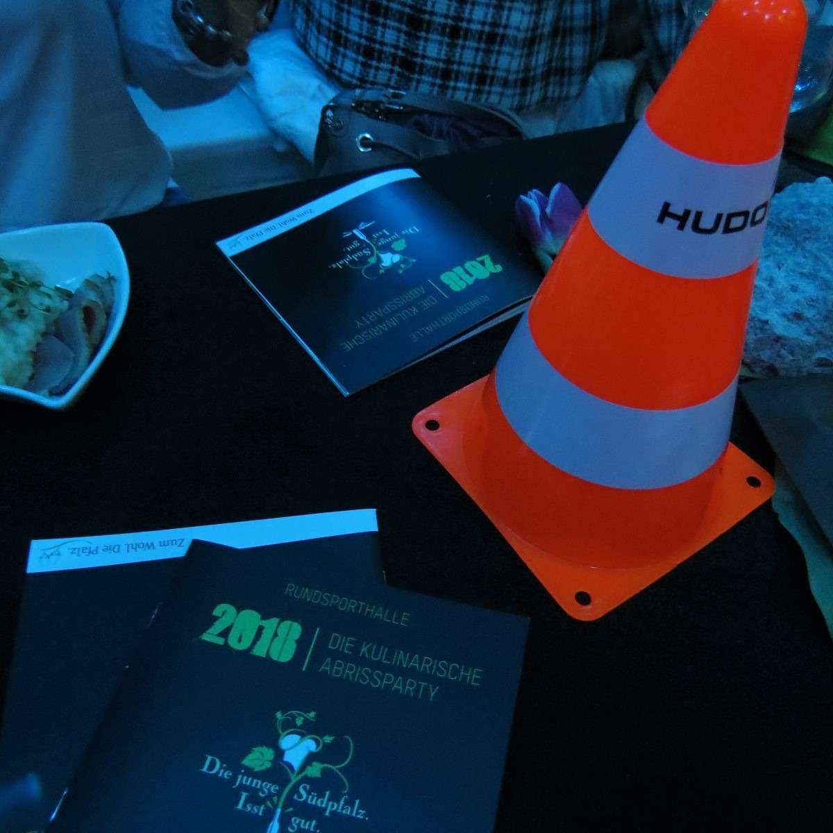 Dieses Jahr fand das Event in der zum Abriss freigegebenen Rundsporthalle in Landau statt. Dem Anlass entsprechend lautete das Motto: „Kulinarische Abrissfeier“. In der Halle und an den Ständen zog man dieses Motto auch sehr kreativ durch, sowohl was die Deko als auch die Aufmachung anging: An der AbrissBAR und der UnkaputtBAR konnte man sein Weinglas auffüllen lassen, auf den Tischen standen kleine Pylonen und handliche Gesteinsbrocken und sowohl vor der Halle als auch an der Bühne waren Schaufelbagger aufgestellt. Das Thema wurde perfekt umgesetzt würde ich sagen!