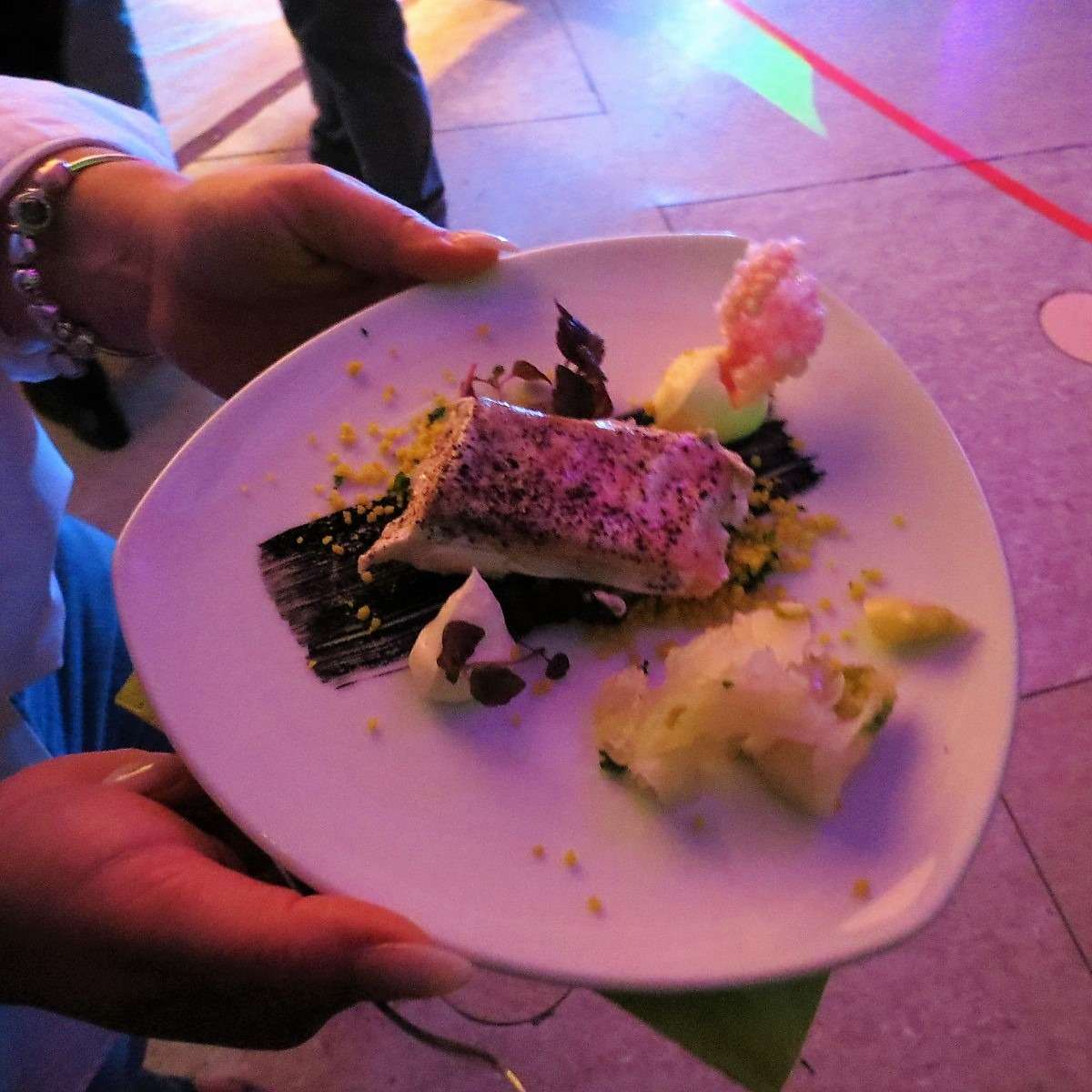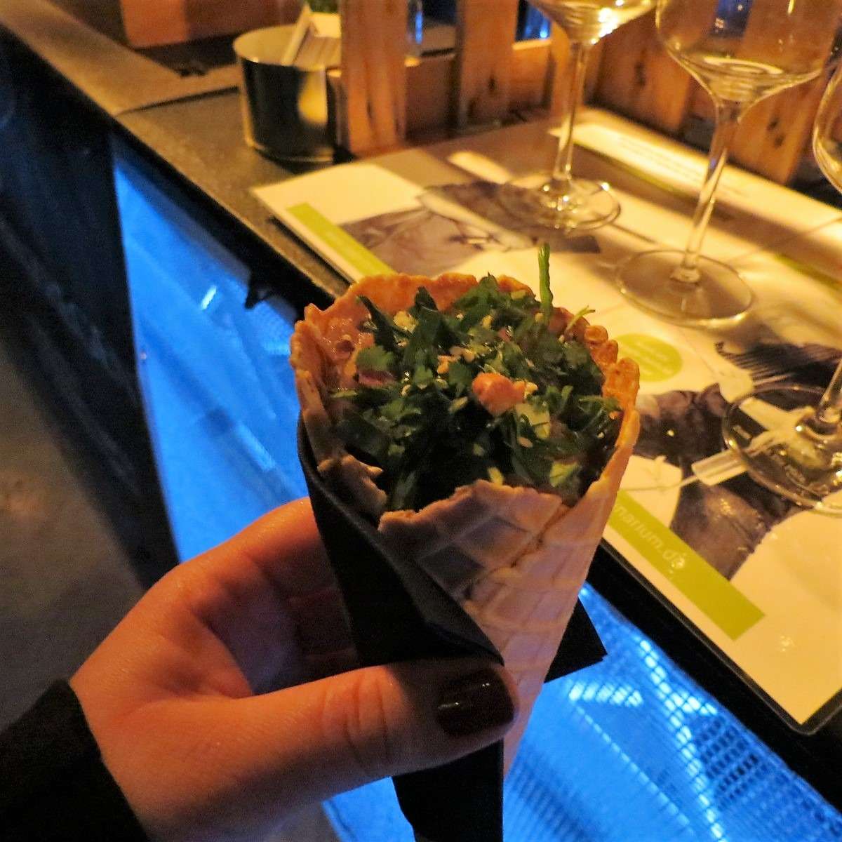 Bei Oliver vom Restaurant „mama’s“ in Edenkoben gab es gehacktes Kalb, Karotten-Kartoffel, Stunden-Ei und glacierte Schalotte. Leider war ich hier einfach zu spät dran um zu kosten, da ich nach drei bereits probierten Gerichten schon ziemlich satt war und die Küche ja auch irgendwann ihren wohlverdienten Feierabend hatte. Aber was ich auf den Tellern der anderen Gäste, die Olivers Gericht probierten, gesehen habe, sah richtig lecker aus. Bei Nico vom Culinarium in Bad Bergzabern wartete ein gewaffelter Thunfisch mit rosa Ingwer, Guacamole, Wasabi, Wakamealgen, Karotten und Bambus auf mich – für mich als Sushi- und Avocado-Fan genau das Richtige. „Gewaffelt“ heißt in diesem Fall: alles in einer Waffel serviert, und so machte auch dieses Gericht nicht nur geschmacklich, sondern auch optisch einiges her.