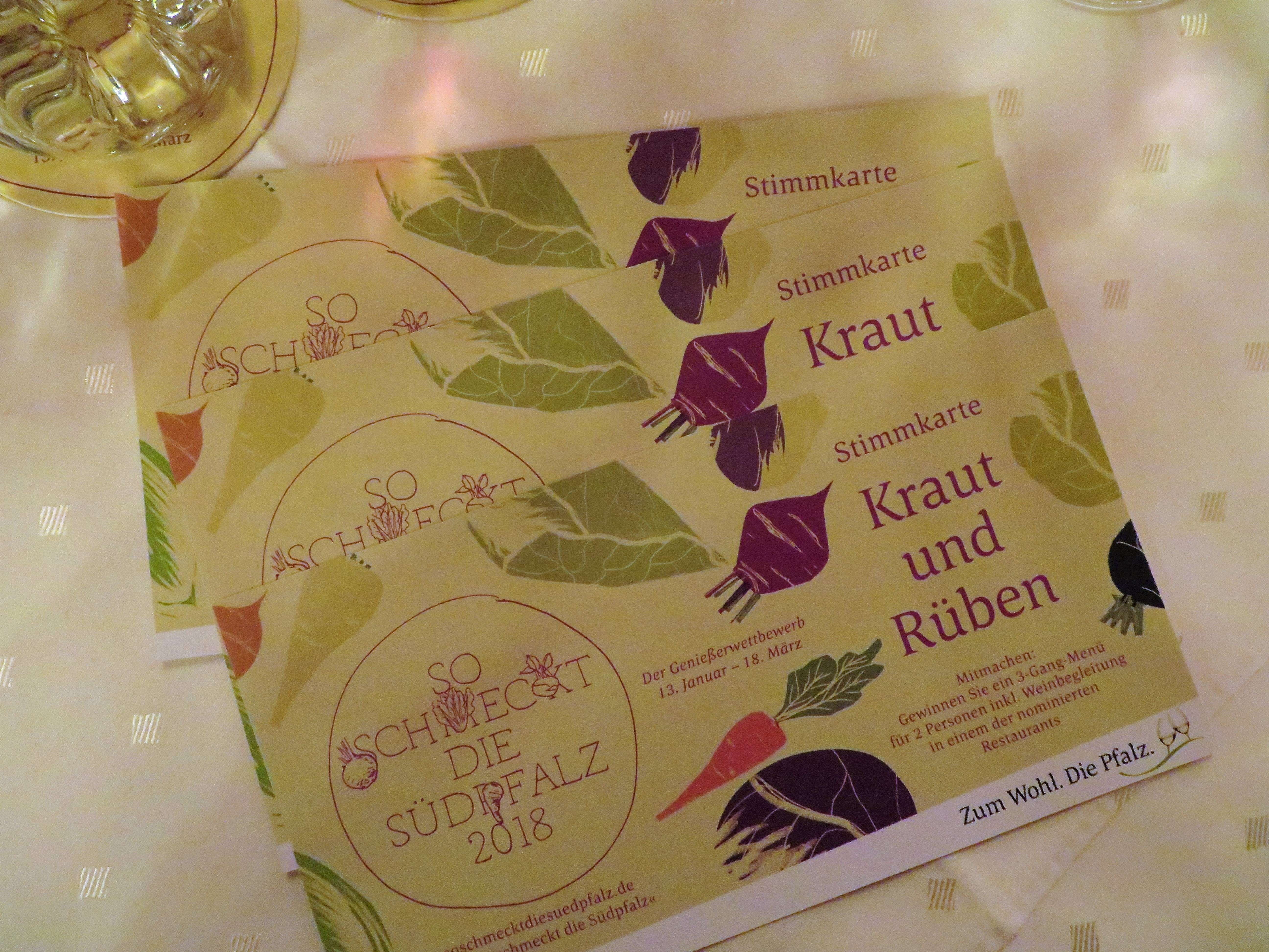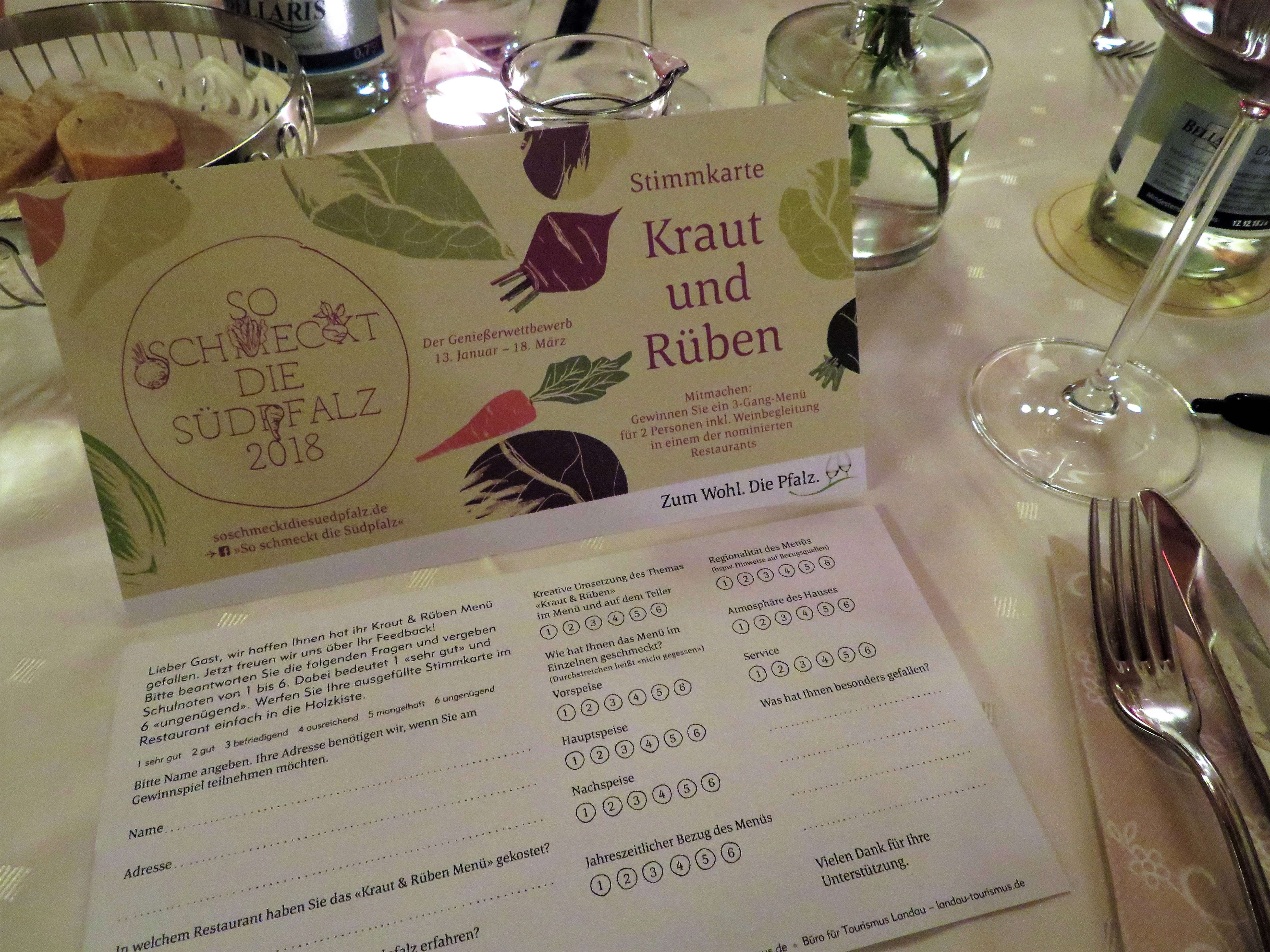 Na, Appetit bekommen? Der Genießerwettbewerb „So schmeckt die Südpfalz“ zum Thema Kraut und Rüben endet am Sonntag, also nutzt noch die Gelegenheit für ein leckeres Essen bei einem der vielen tollen Restaurants. Alle Betriebe und die Menüs habe ich Euch am Ende des Beitrags nochmal aufgelistet und verlinkt. Und nicht vergessen die Stimmkarten auszufüllen!