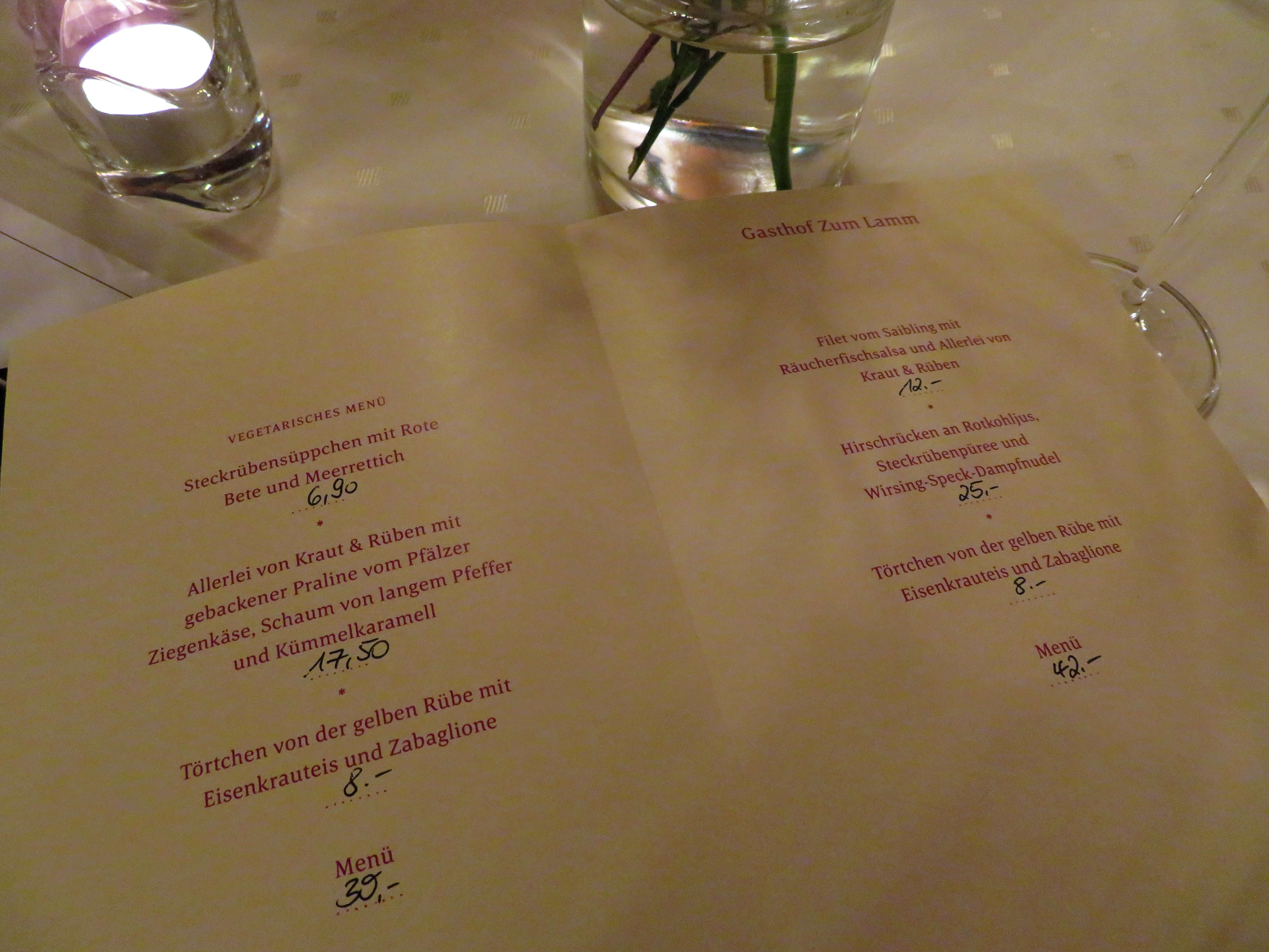 Mein Freund stellte sich sein eigenes Menü aus der Karte zusammen. Meine Eltern und ich freuten uns schon auf das „Kraut und Rüben“-Menü, das wir teilweise leicht umstellten. Meine Mama wählte die vegetarische Variante des Menüs und mein Papa und ich die für „Fleischfresser“. Allerdings lachte uns beide die Steckrübensuppe der vegetarischen Variante so an, dass wir diese anstelle des Filets vom Saibling als Vorspeise wählten. Die Weinempfehlungen zum Menü haben wir so nicht befolgt, denn kaum sehe ich einen St. Laurent auf der Weinkarte, in diesem Fall vom Ökonomierat J. Kleinmann aus Birkweiler, ist für mich alles andere passé. Meine Mama wählte den Grauburgunder vom Weingut Gies-Düppel, ebenfalls aus Birkweiler.