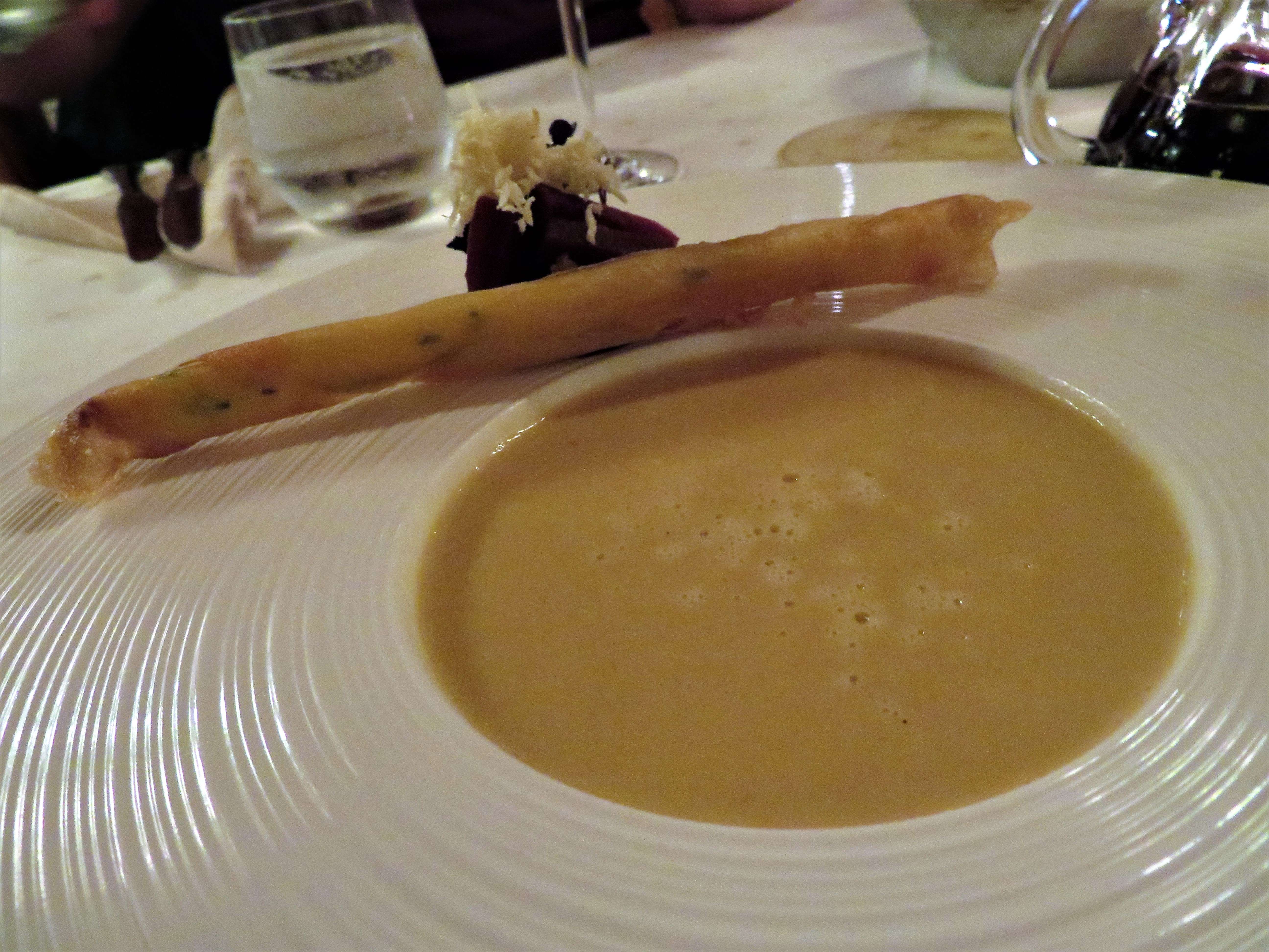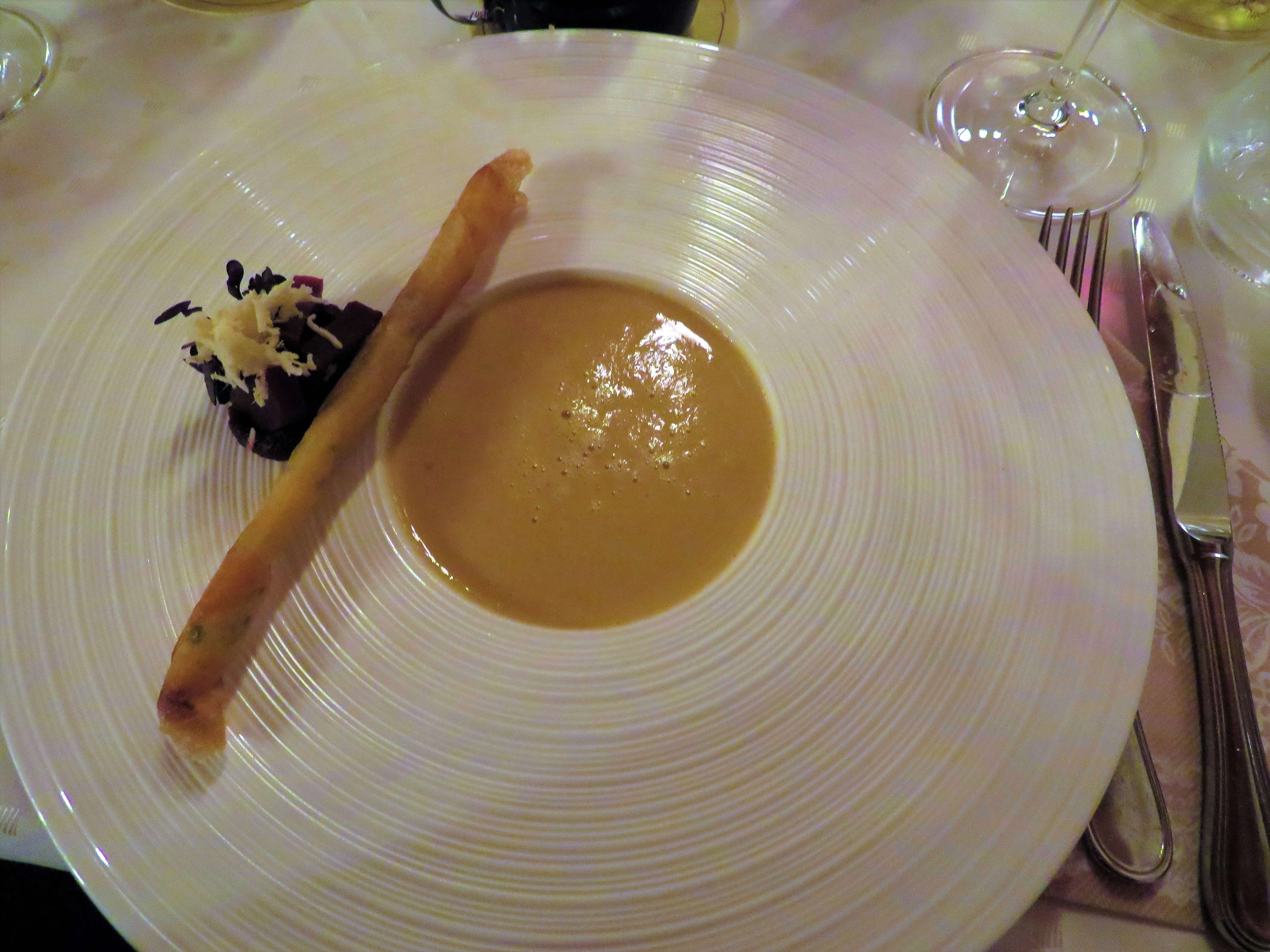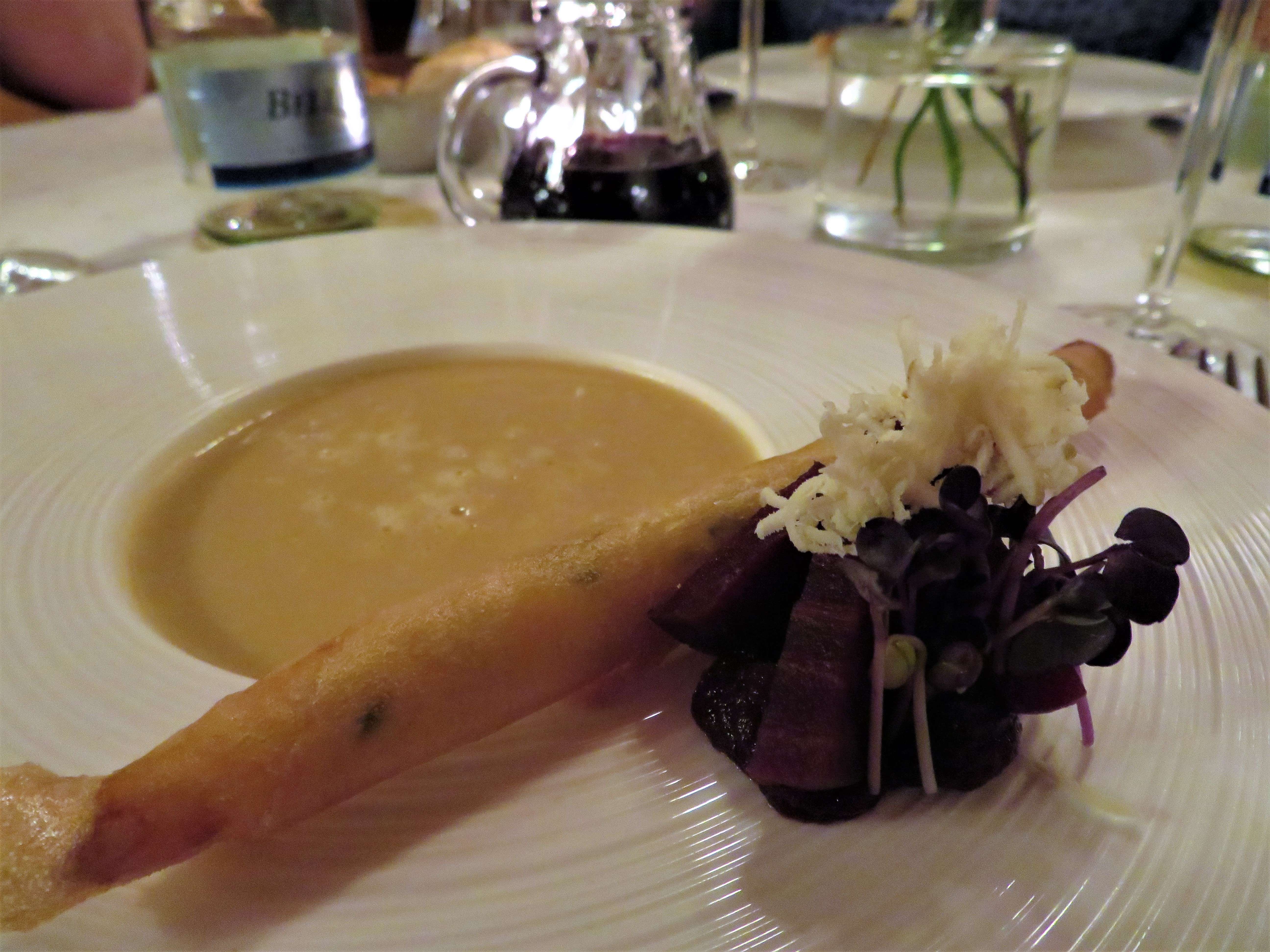 Darauf folgte die Vorspeise, eine leckere cremige Steckrübensuppe mit Rote Bete und Meerrettich. Auf der Karte nicht erwähnt, aber ebenfalls auf dem Teller, war eine Art Ziegenkäse-Crissini, eingewickelt in Filoteig. Die Suppe war köstlich und ich hätte mir gewünscht, dass noch mehr Suppe als Teller vor mir gestanden hätte (ich sage nur: Schallplattenteller). Aber Spaß beiseite, die Vorspeise war sehr, sehr gut und machte Appetit auf mehr.
