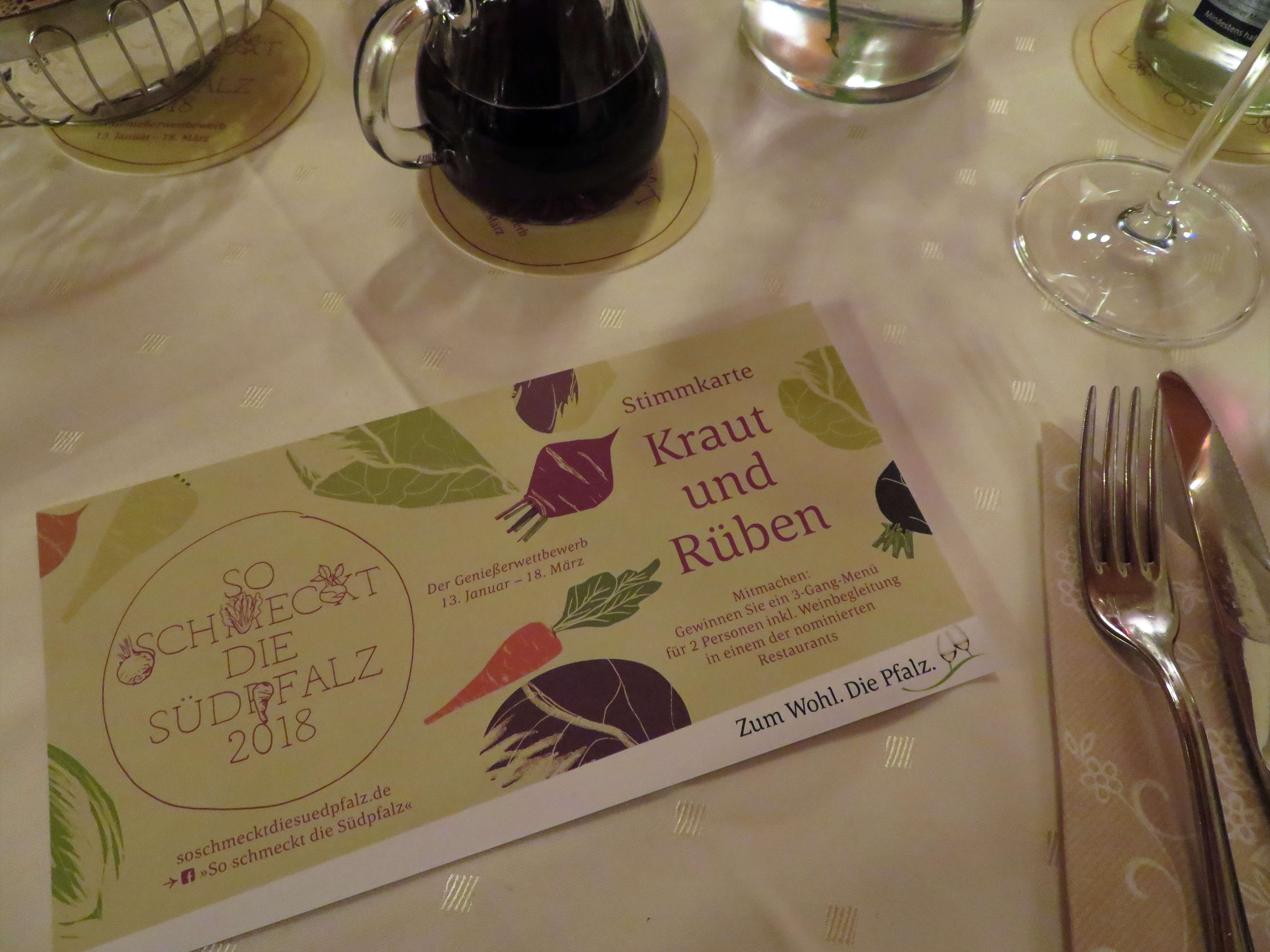 den morgigen Blogpost habe ich mal ganz spontan auf heute vorverlegt, allerdings nicht ohne Grund. Morgen endet der Genießerwettbewerb „So schmeckt die Südpfalz“ zum Thema „Kraut und Rüben“. Ich durfte bereits das wirklich leckere Menü in der Kapeller Hopfestubb in Kapellen-Drusweiler genießen und darüber auf meinem Blog berichten. Mir gefällt das Thema des Wettbewerbs „Kraut und Rüben“ und dessen kulinarische Umsetzung bei den vielen teilnehmenden Restaurants besonders gut. Ein erneuter Besuch bei einem der Betriebe stand also außer Frage. Vielleicht bekommt Ihr ja auch Lust dieses Wochenende noch spontan eines der tollen Menüs zu probieren.