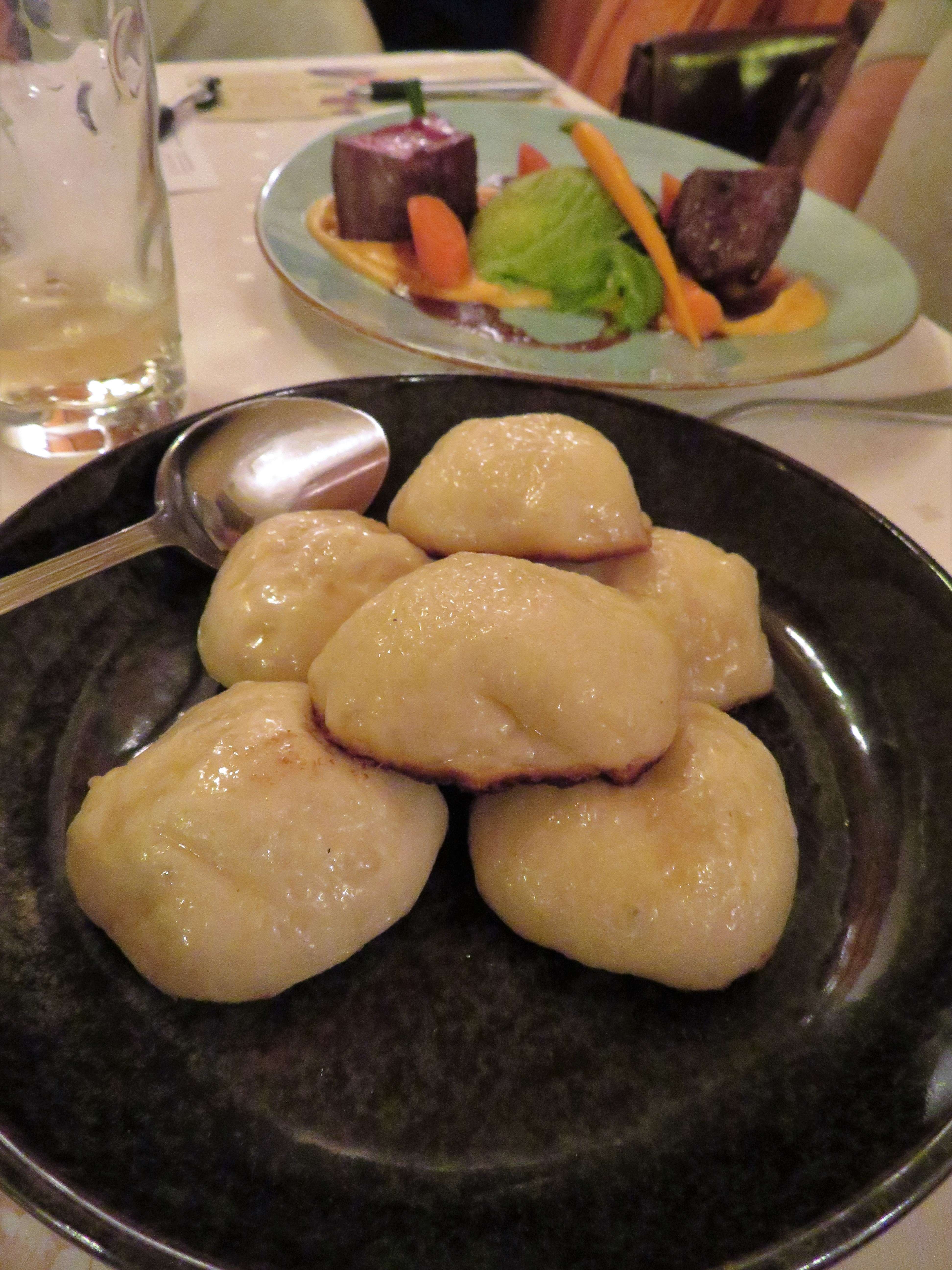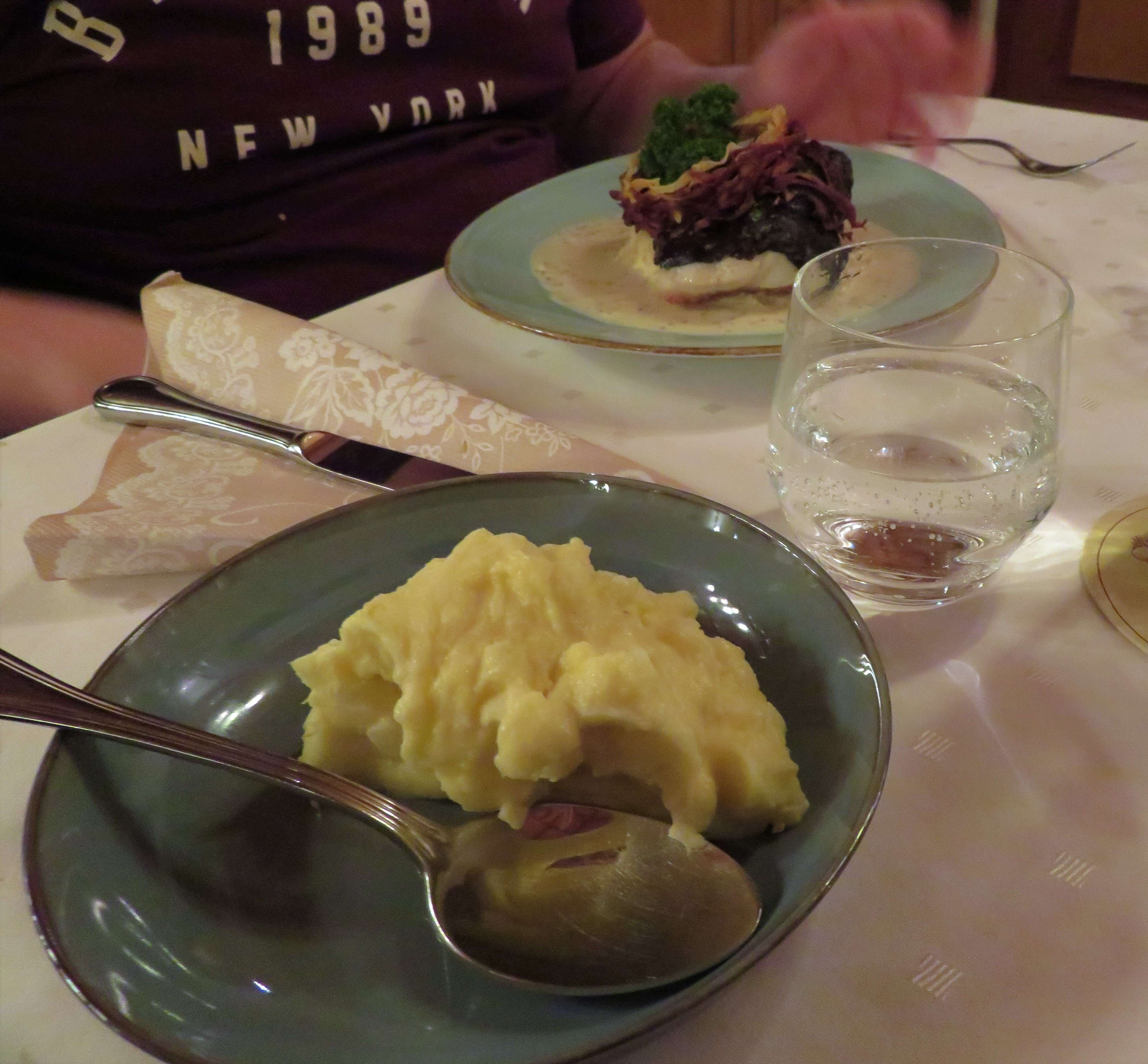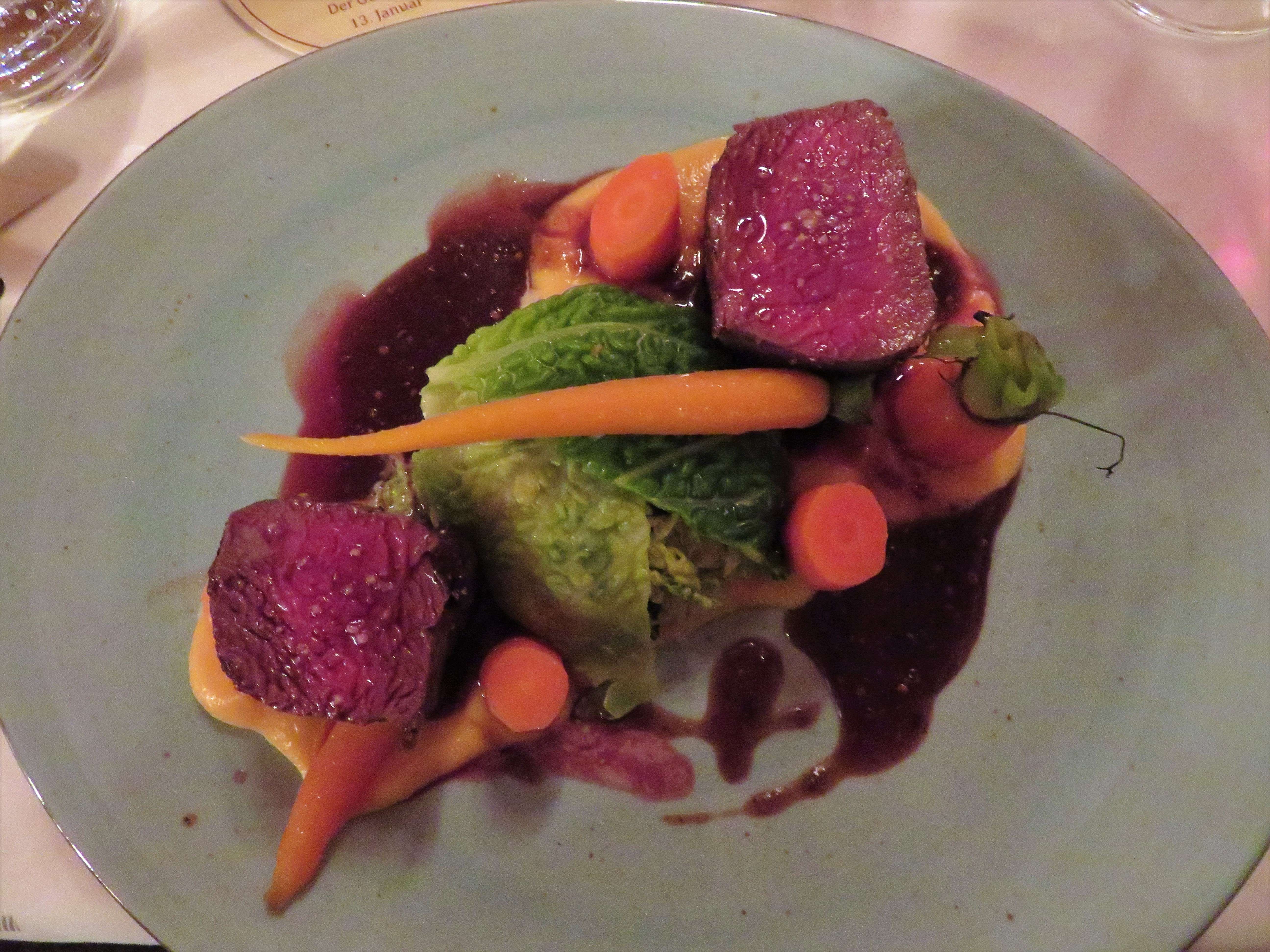 Mein Papa und ich hatten den Hirschrücken an Rotkohljus, Steckrübenpüree und Wirsing-Speck-Dampfnudeln.