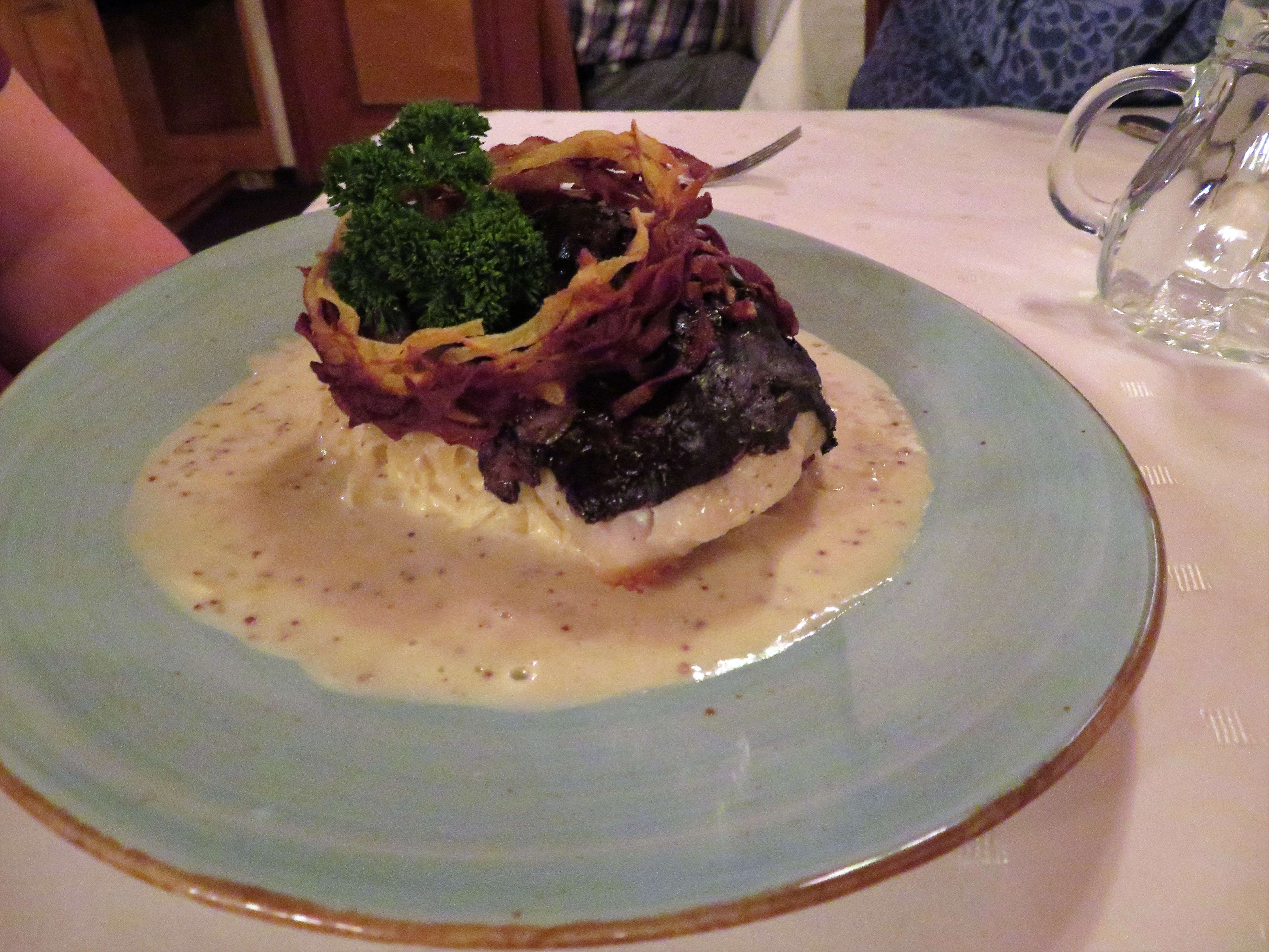 Auch die Hauptspeise meines Freundes, wenn auch nicht Teil des „Kraut und Rüben“-Menüs, möchte ich Euch natürlich nicht vorenthalten. Er hatte sich für das Zanderfilet mit Blutwurstkruste, Rahmsauerkraut und Kartoffel-Apfel-Püree entschieden. Der Fisch war sehr lecker und auch das Kartoffel-Apfel-Püree war ein Traum. Ich kann Euch nur raten, auch mal ganz kleine Apfelstücke unters Kartoffelpüree zu mischen, es schmeckt genial.