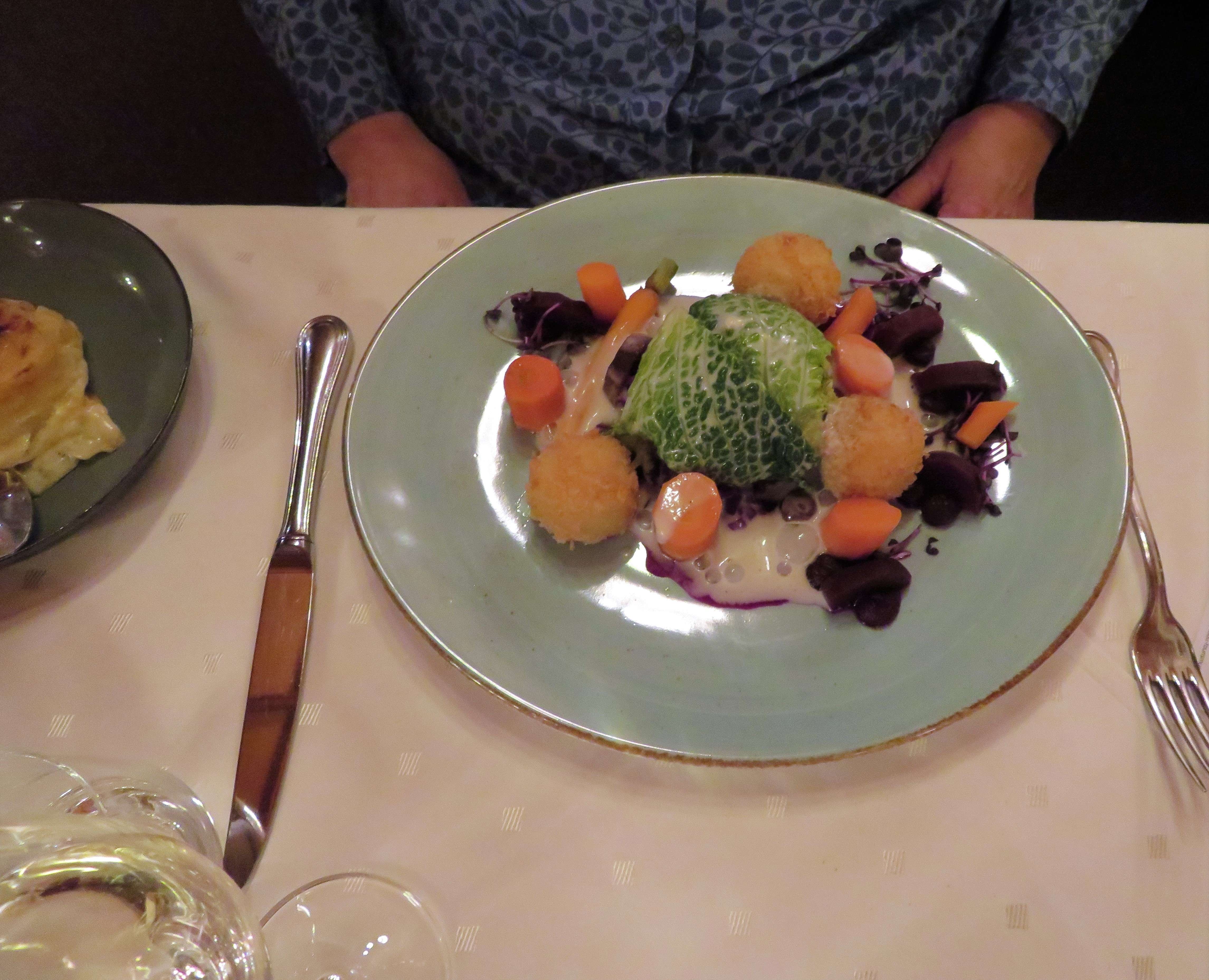Die vegetarische Variante des Hauptgangs bestand aus Allerlei von Kraut und Rüben mit gebackener Praline vom Pfälzer Ziegenkäse, Schaum von langem Pfeffer und Kümmelkaramell.