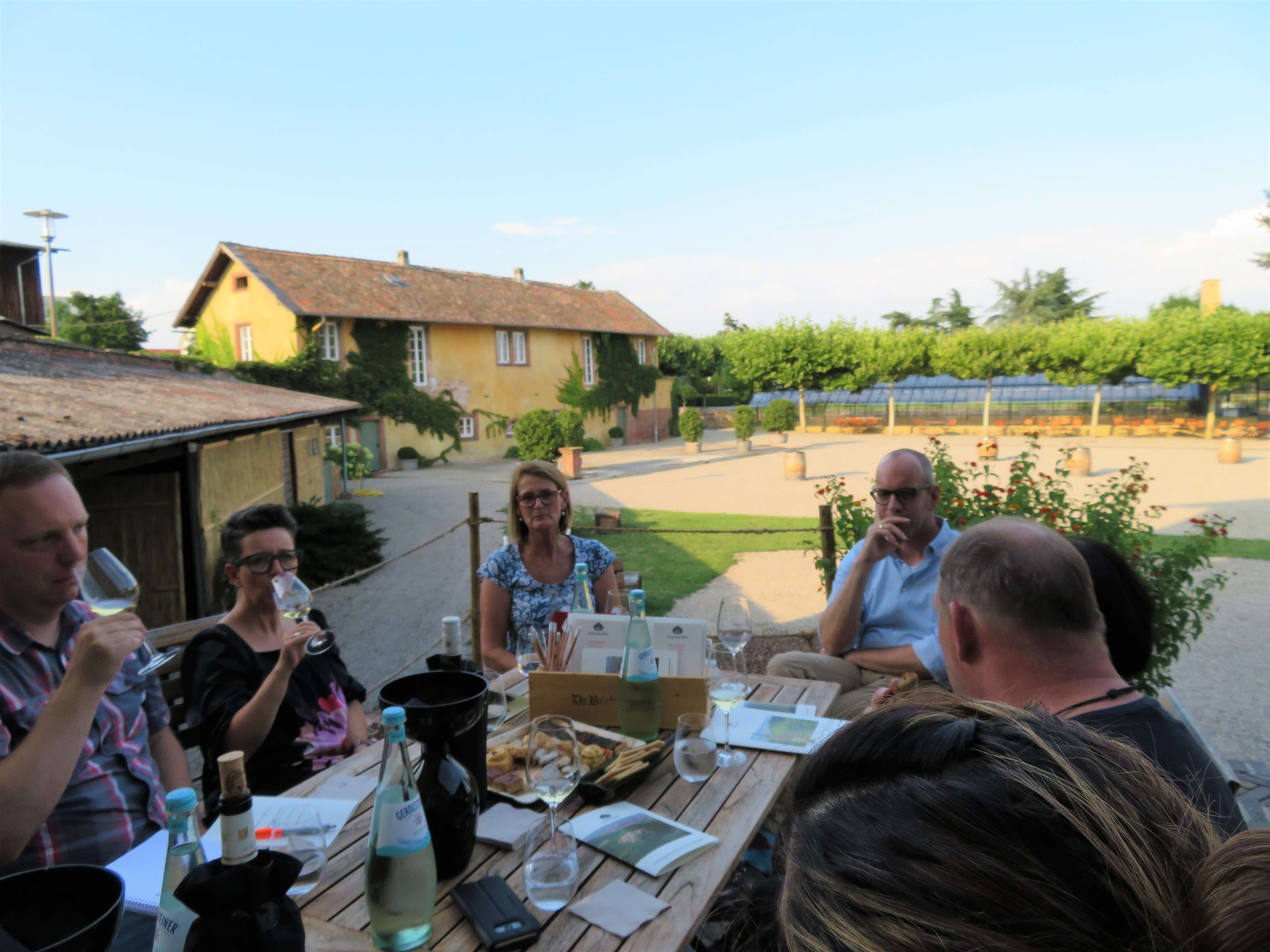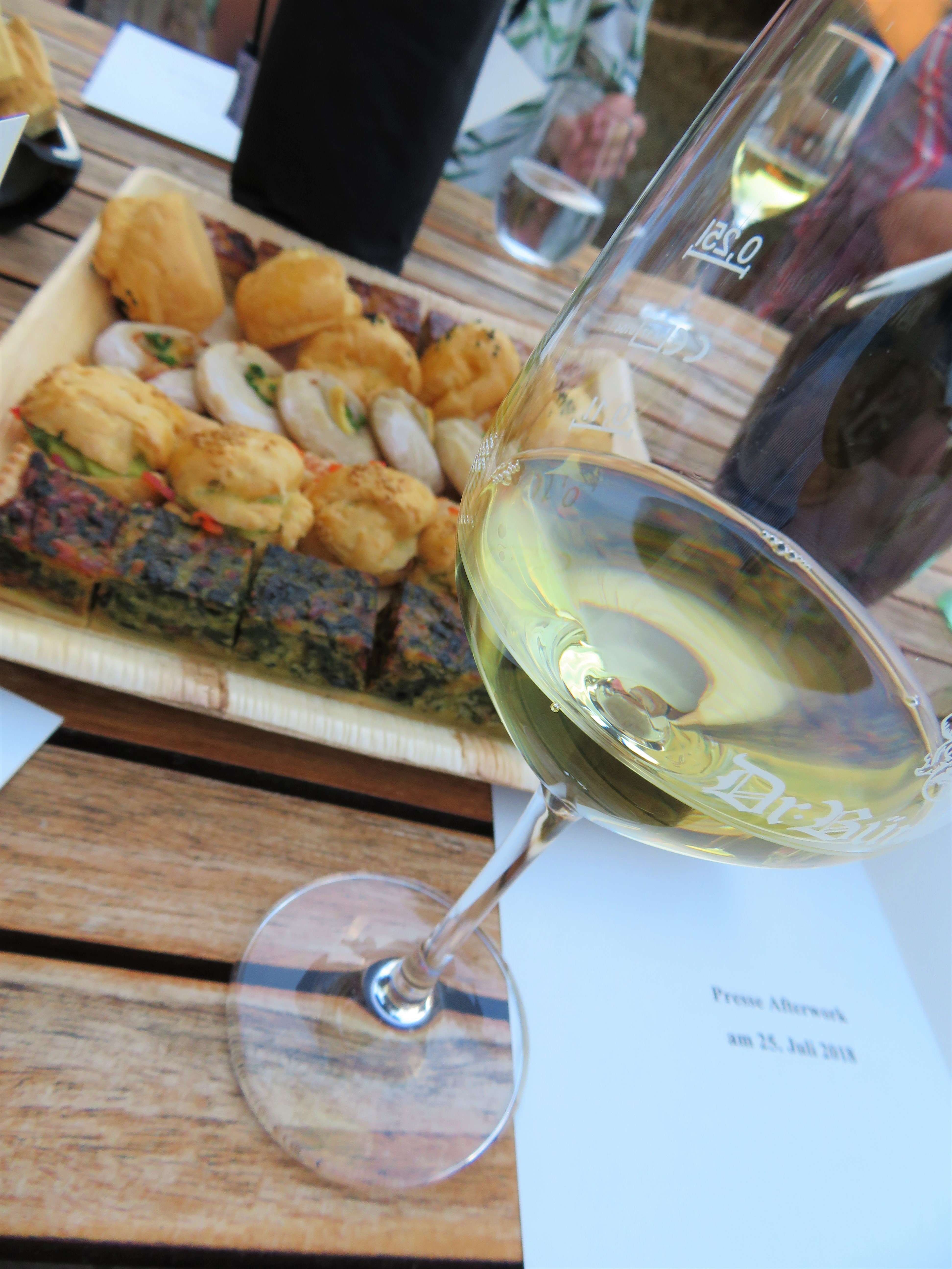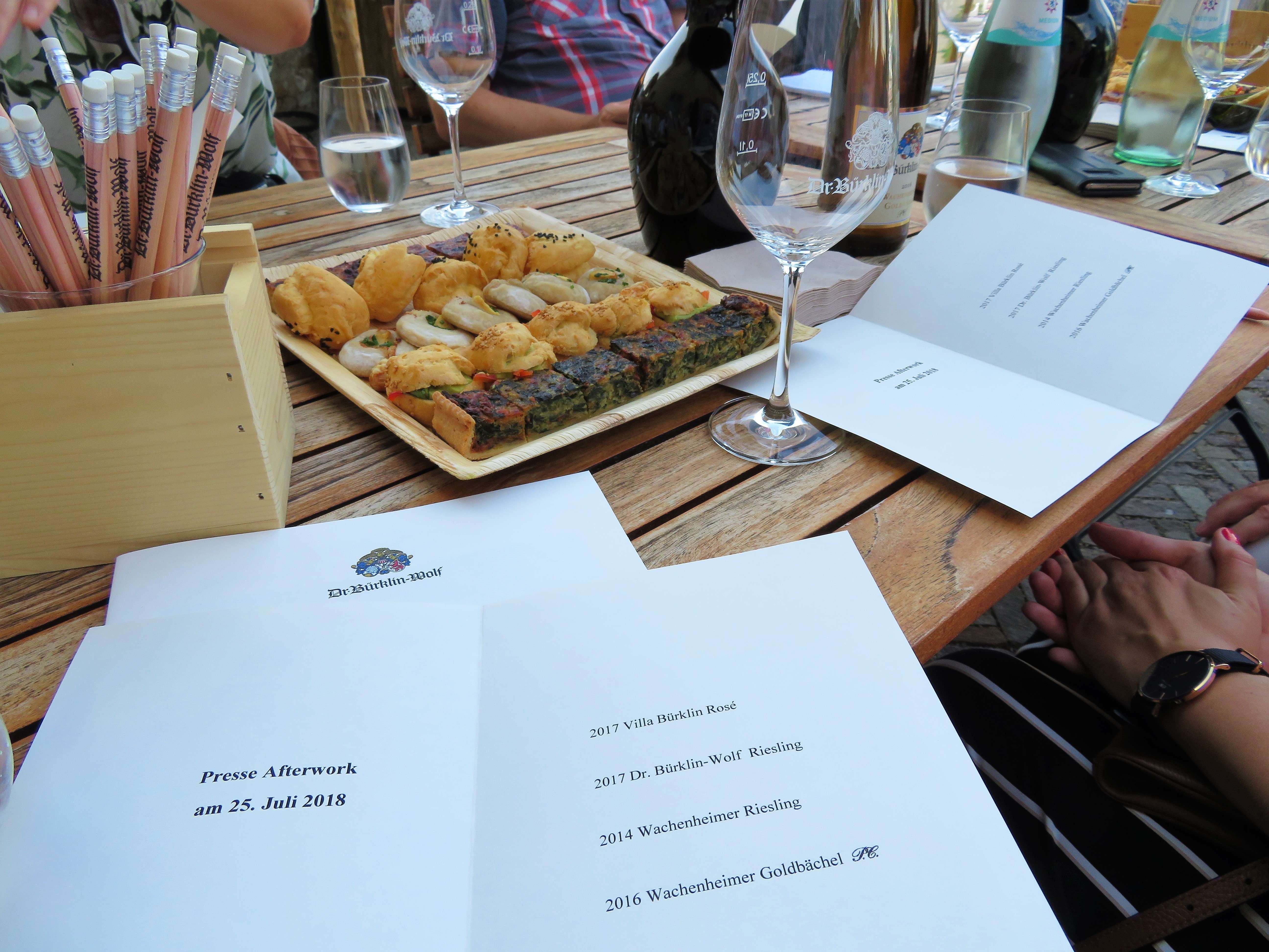 Auf der schattigen Terrasse bei der Vinothek durften wir dann noch ein paar andere gute Tropfen des Weinguts probieren: den 2017er Dr. Bürklin-Wolf Riesling, den 2014er Wachenheimer Riesling und den 2016er Wachenheimer Goldbächel. Dazu gab es kleine, feine Leckereien und wir genossen den lauen Sommerabend bei angeregten Gesprächen in einer Traum-Location!