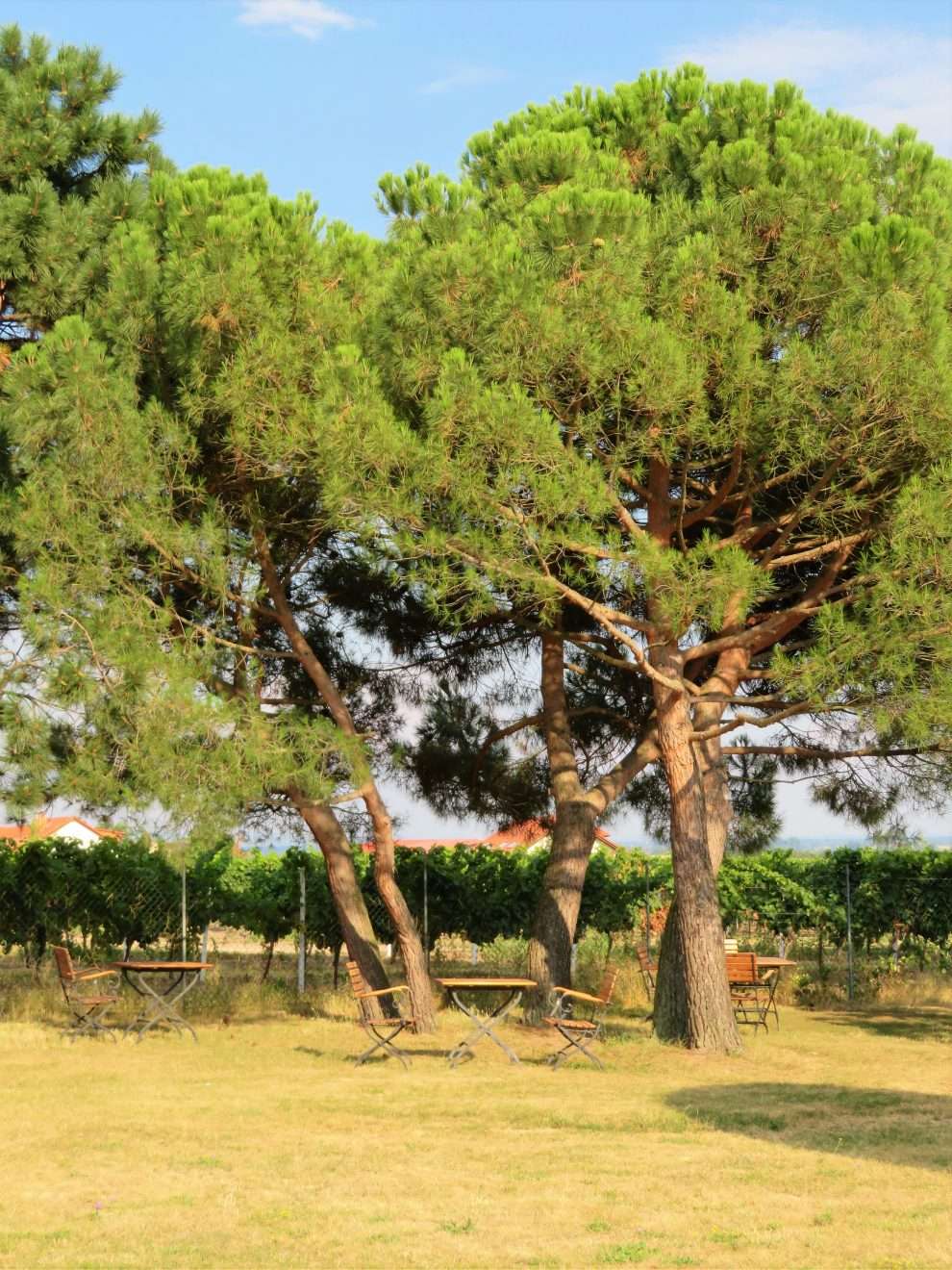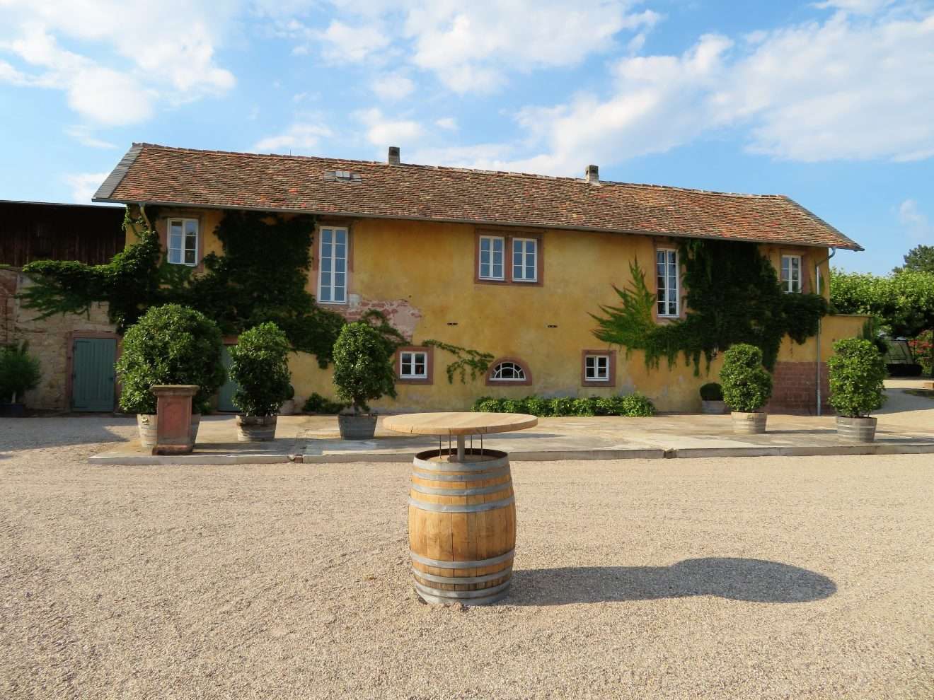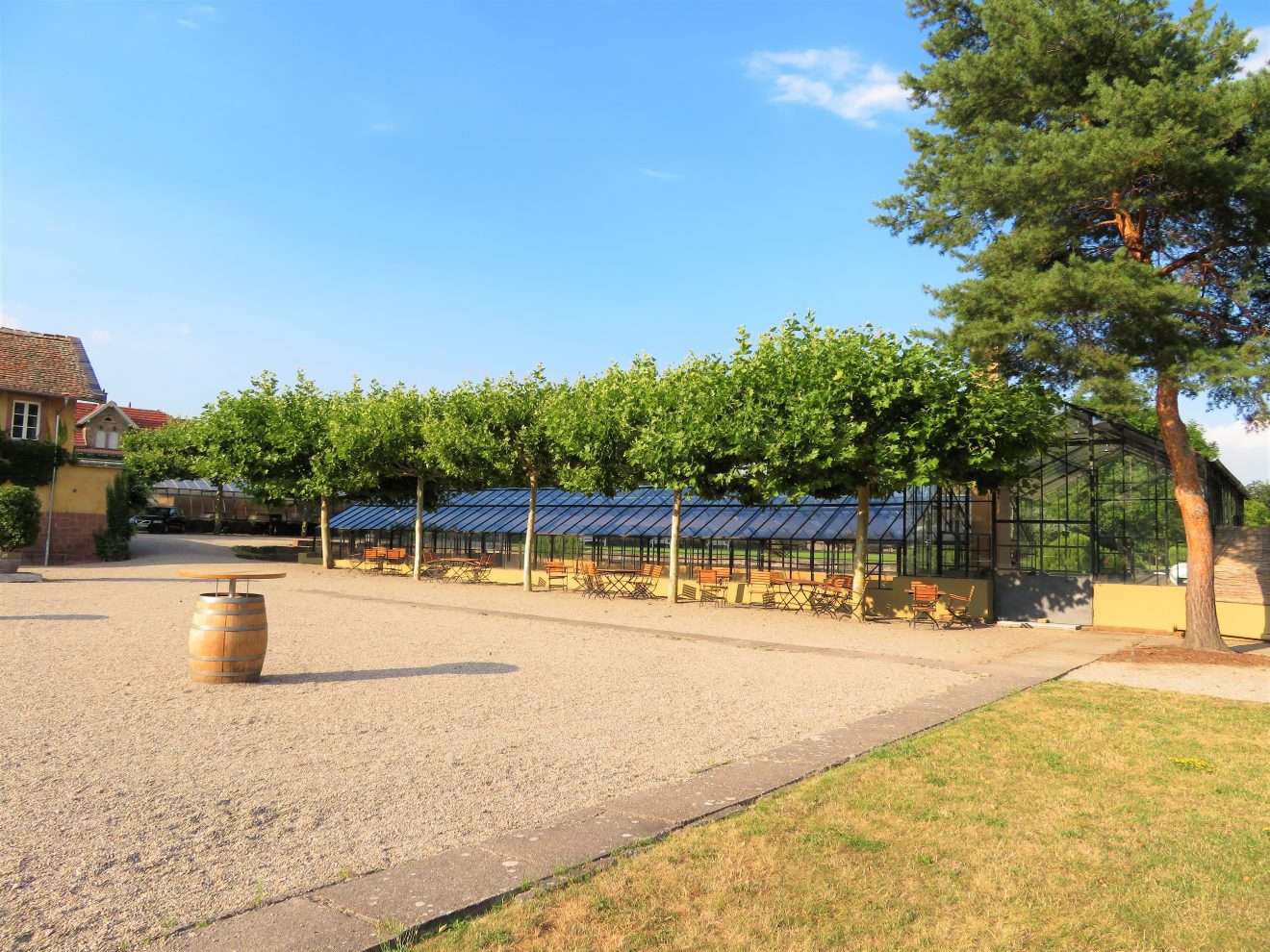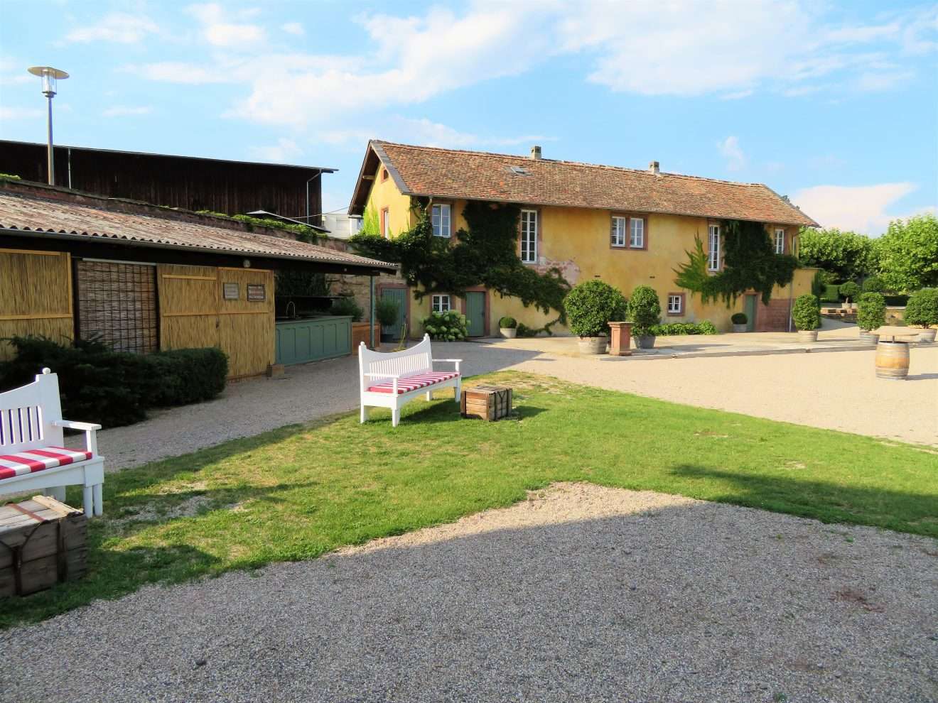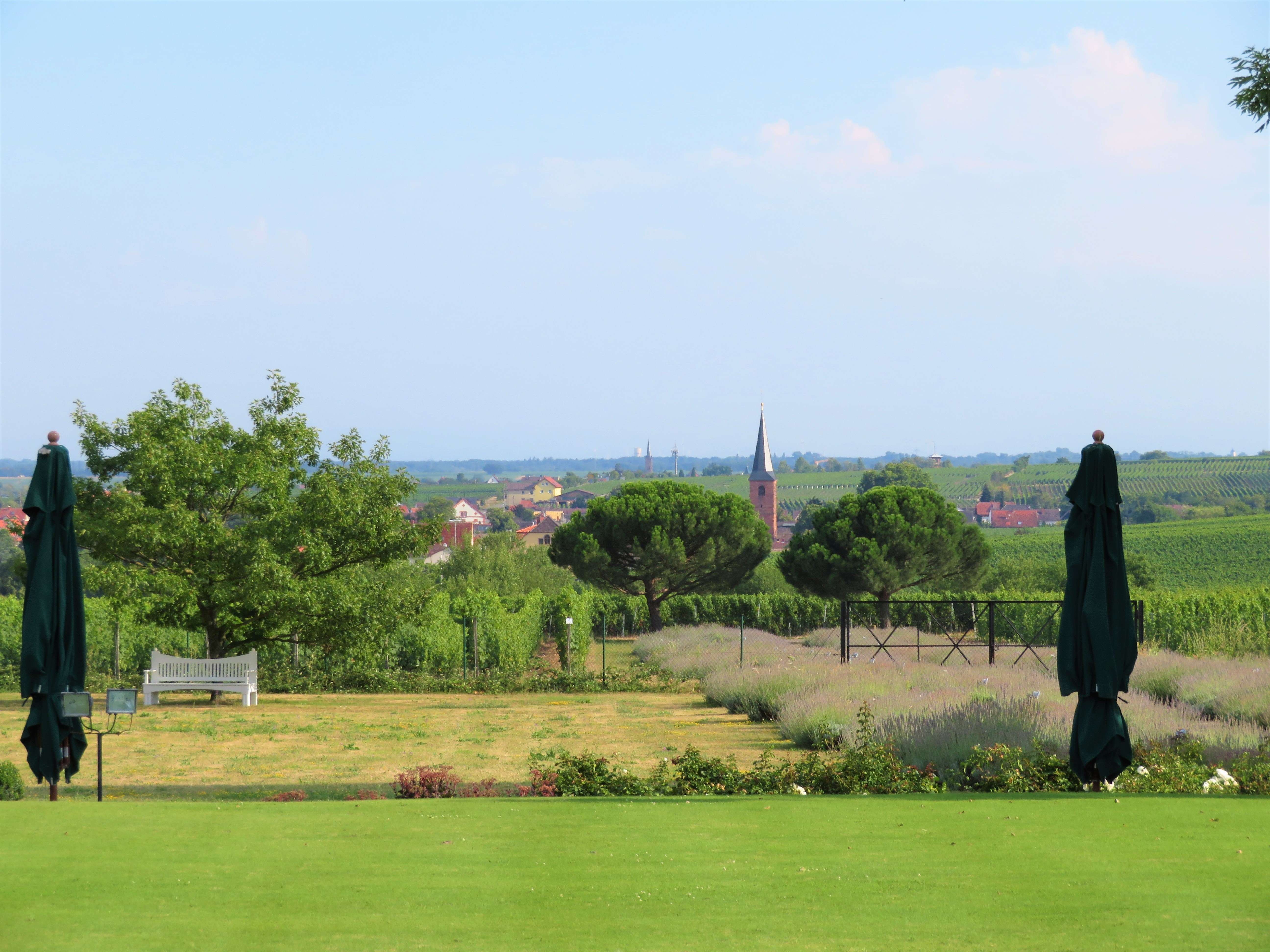 Wer die 2017 eröffnete Vinothek in der Ringstraße 4 in Wachenheim besucht, kann sich bei der Verkostung der Weine nun auch in den Garten zurückziehen, auf einer der vielen Sitzgelegenheiten Platz nehmen und dabei den Blick durch den Garten schweifen lassen oder auf die umliegenden Weinreben, die Rheinebene, Forst und die Ausläufer des Pfälzer Waldes schauen.