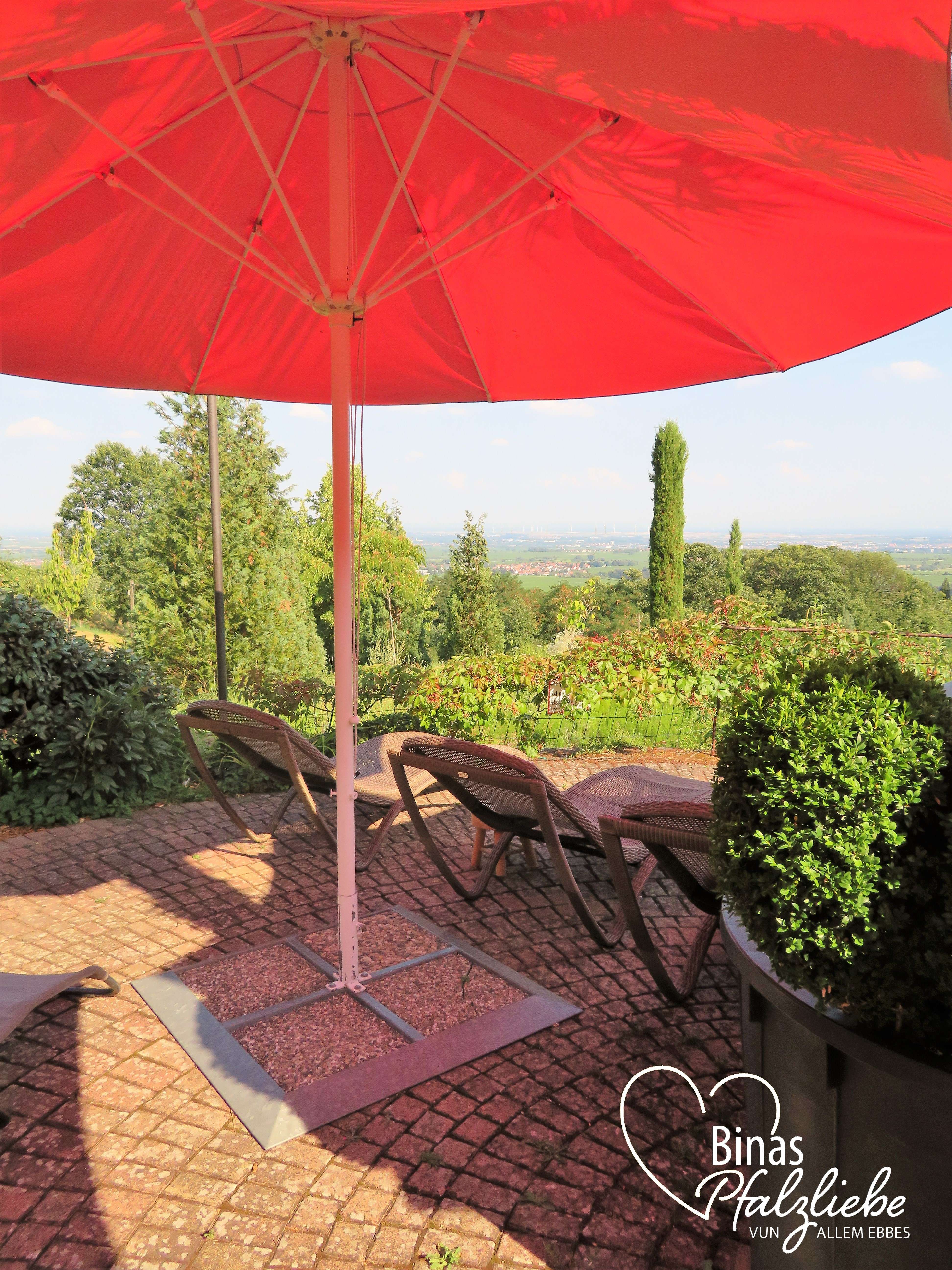 Anfang August waren wir im Sankt Anngut, nahe der Annakapelle. Das Restaurant liegt oberhalb von Burrweiler und wenn ich sage oberhalb, dann dürft Ihr das gerne wörtlich nehmen, denn der Ausblick von dort ist fantastisch! Auf 355 Metern Höhe habt Ihr einen sagenhaften Blick über die Rheinebene!