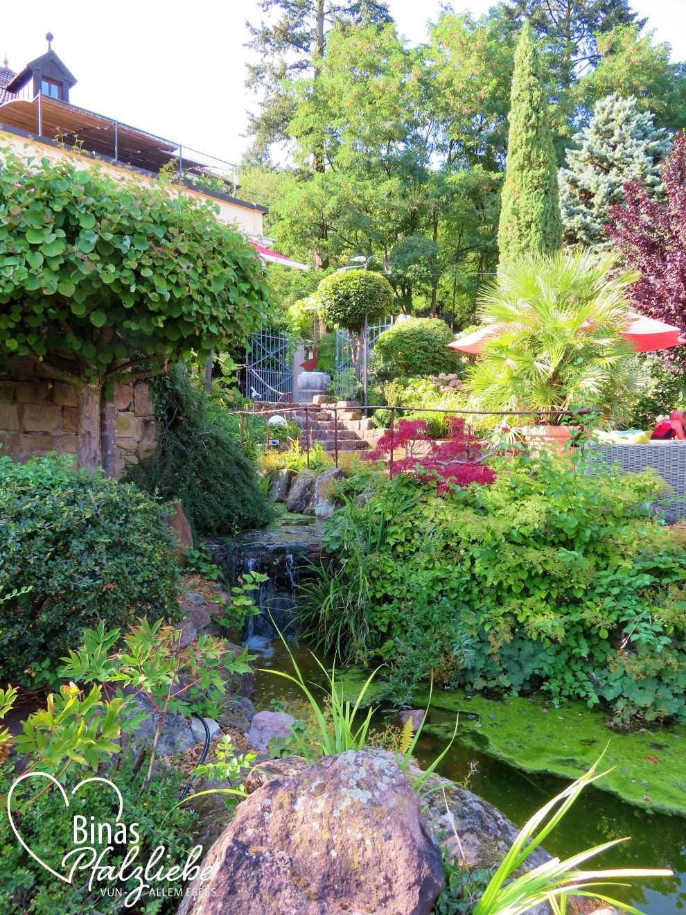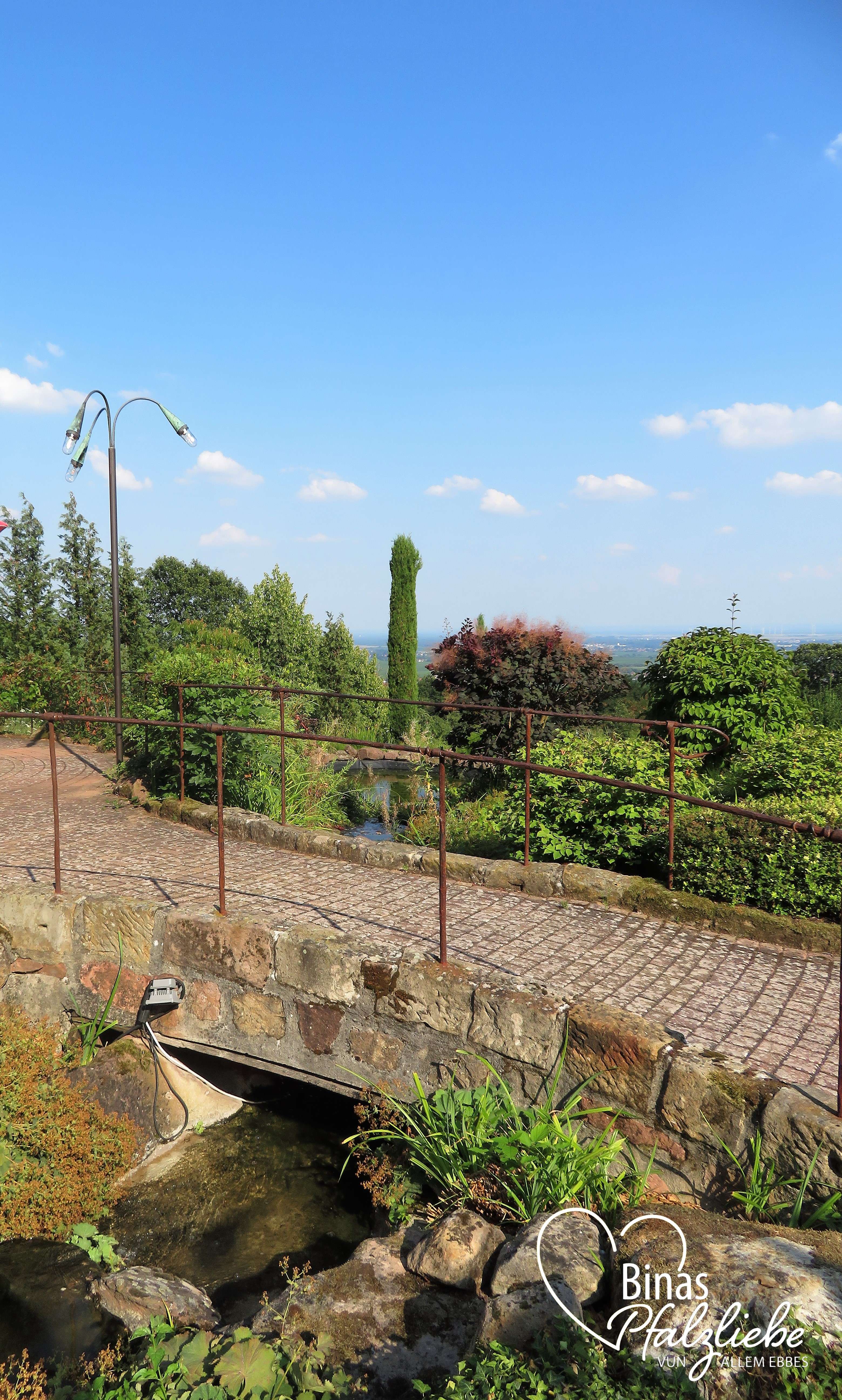 Auf der Lounge-Terrasse ist Selbstbedienung mit Flammkuchen und Getränken. Und ein Glas Wein und ein kleiner Happen machen diese Aussicht doch gleich noch schöner. Zu der Terrasse gehört ein traumhaft angelegter Garten mit einem kleinen Bachlauf in der Mitte und einem Teich.