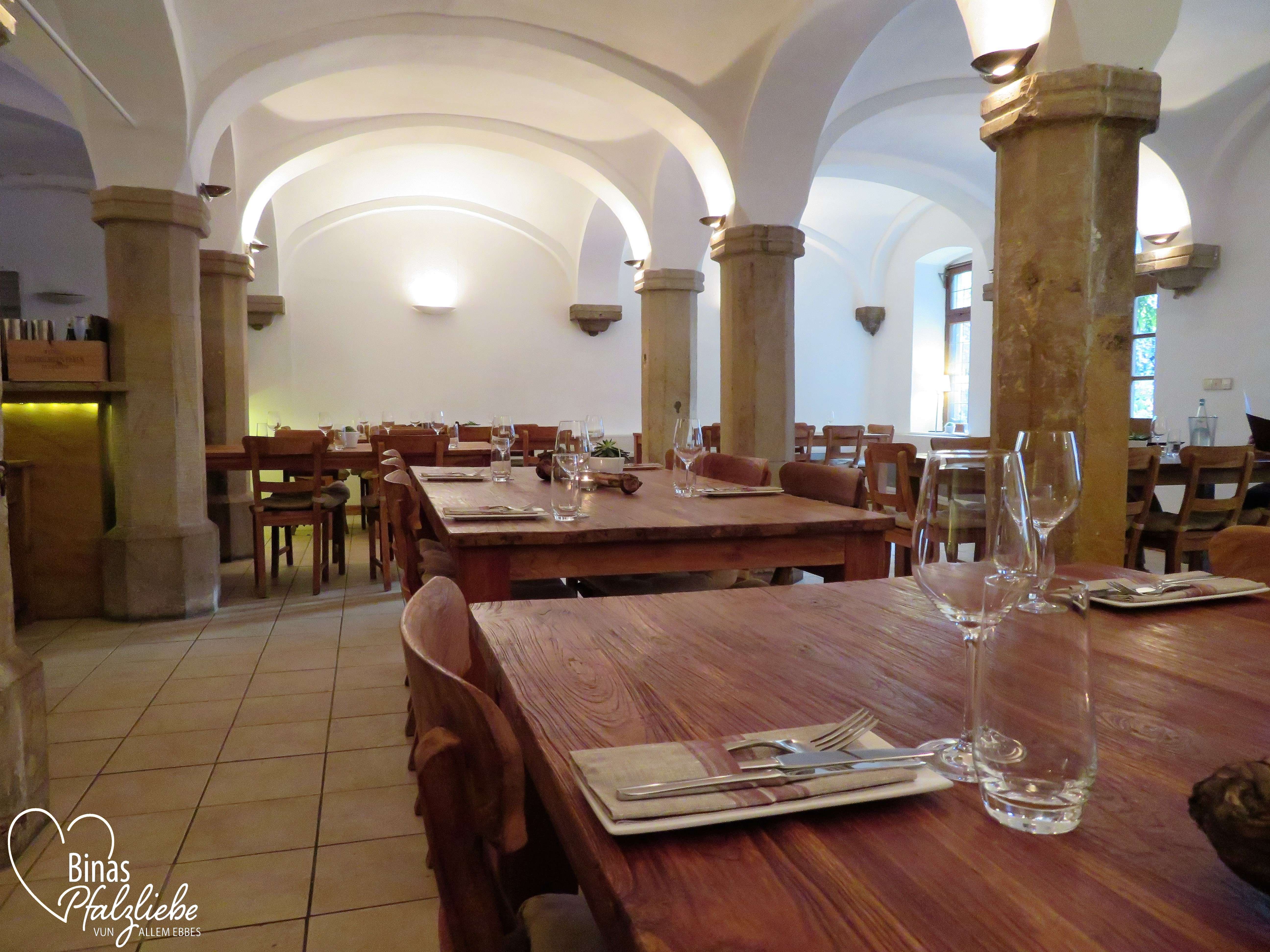 Drinnen erwartet uns in Siben’s Gutsküche ein großer Raum mit mehreren Sandsteinsäulen, auf denen die Gewölbedecke ruht. Was hier ursprünglich mal ein Pferdestall war, ist jetzt ein Restaurant mit schönen langen Holztischen und hübsch eingedeckten Tischen.
