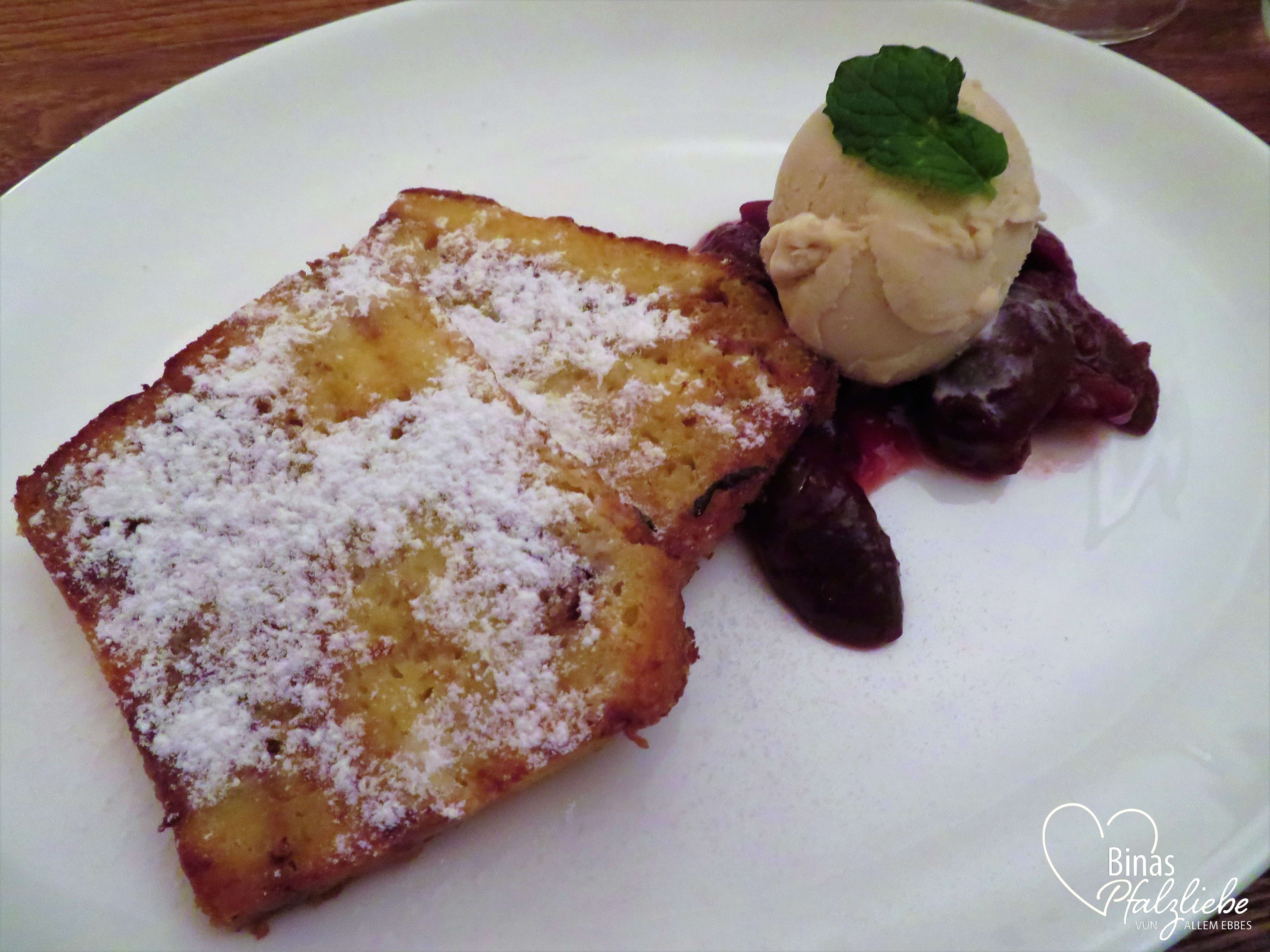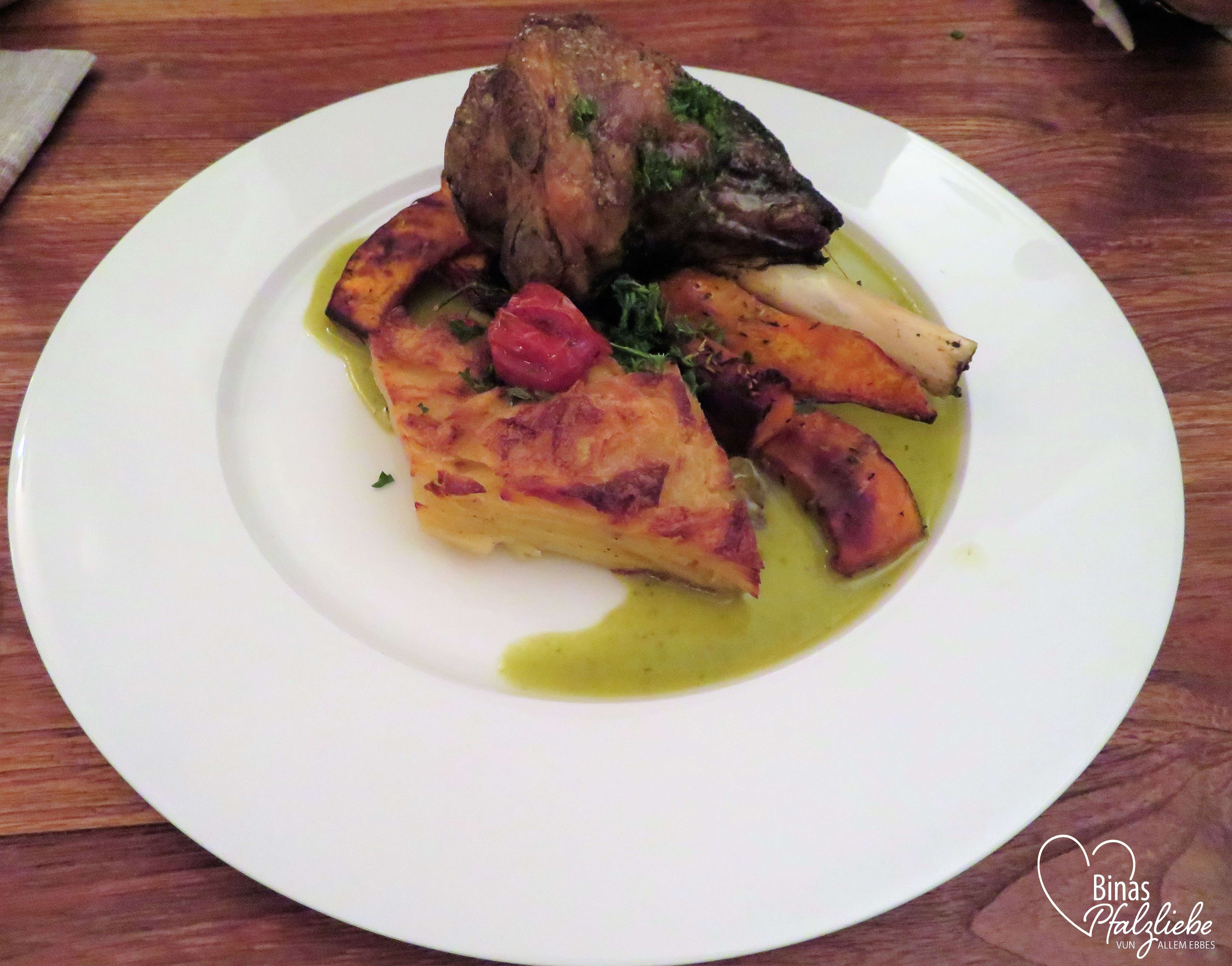 Aus der saisonalen Karte wählten wir unsere Leibgerichte des Abends. Für Nadine gab es gegrillte Lammhaxe mit Ofenkürbis und Kartoffelgratin und für mich die geschmorte Hirschkalbskeule mit Rotkohl und Schneebällchen. Letztere sind nach einem Rezept der Oma gemacht. Ich kann Euch gar nicht sagen, wie sehr ich mich freue, dass nun auch auf den Speisekarten der Herbst Einzug hält und es wieder so viele Schmorgerichte und Wildspezialitäten gibt. Wir haben es uns schmecken lassen und zum süßen Abschluss gab es noch eine Portion Arme Ritter mit Rotweinzwetschgen und Vanilleeis für jeden. Genuss pur und eine tolle Restaurant-Empfehlung meiner lieben Blogger-Kollegin!
