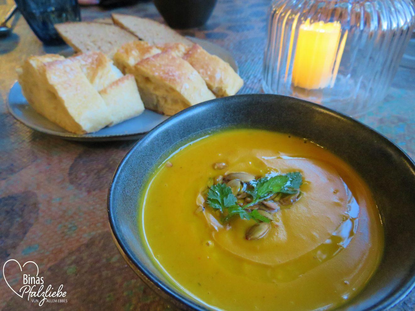 Auf der Karte stehen neben Tapas und Flammkuchen auch Wurst- und Käsevariationen, sowie Salate. Bei den Hauptgängen à la carte sorgen Thunfischtranche mit Teriyaki Schaum oder die mit Pulled Pork gefüllten Ravioli mit Schmorzwiebeln dafür, dass einem das Wasser im Mund zusammenläuft. Die Wahl fiel uns schwer bei all den Leckereien. Als Vorspeise wählten wir schließlich eine Kürbissuppe und zum Hauptgang die Ravioli mit Steinpilzen und Parmesan. Ein wahrer Genuss! Den süßen Abschluss bildeten dann die himmlischen Törten von Daniel Rebert, die uns schon von Weitem anlachten. Und da Vera und ich schon fast mit der Nase an der Kühltheke klebten, entschieden wir uns dann gleich mal für drei der wunderschönen Naschwerke, die mit viel Schokolade und goldenen Verzierungen glänzten.