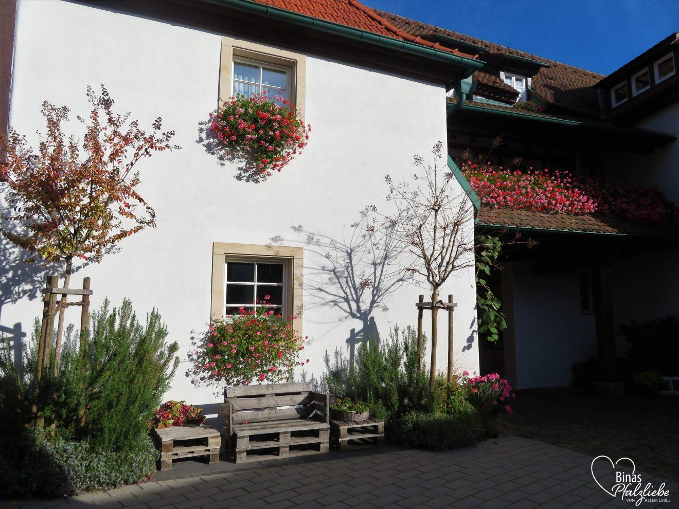 Durch einen hohen Torbogen hindurch führt der Weg in den Hof, in dem neben den zwei Fachwerkhäusern, die den Stammsitz des Weinguts bilden, nun die neue Vinothek mit Proberaum und Verkaufslager steht. Die Fachwerkhäuser sind aus den Jahren 1619 und 1738, die Vinothek von 2015 – alt und neu in direkter Nachbarschaft zueinander. Der kubische Bau wird von einer großen Fensterfront zur Straße hin dominiert. Elemente aus Cortenstahl sorgen für Kontur.