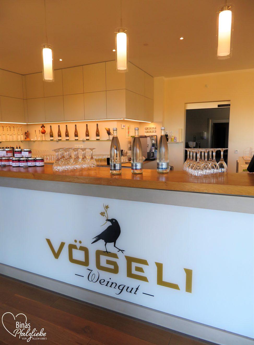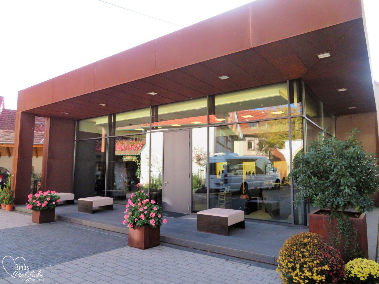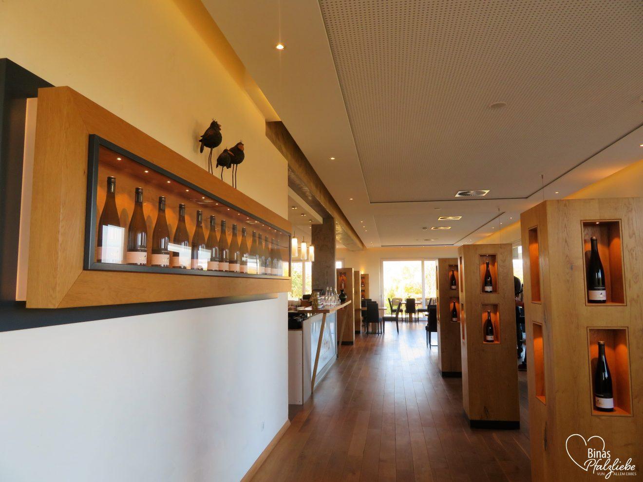 Das erste Ziel des Tages im beschaulichen Landau-Wollmesheim war gleich ein absolutes Highlight. Umringt von herbstlich gefärbten Weinreben steht der Neubau der Vinothek mit dem süßen Namen „Vögelis WeinNest“ in der südpfälzischen Landschaft. Außen stellenweise mit Eichenholz aus der Region verkleidet und mit einer breiten Fensterfront an zwei Seiten der Vinothek, macht der Bau bereits optisch einiges her. Auch im Inneren ziehen sich die Holz-Akzente fort: allein schon bei der Präsentation der Weine, die ihren Platz in den Holzstelen finden, oder bei den schwebenden (!) Bartischen, die mit einem Drahtseil an der Decke befestigt sind.