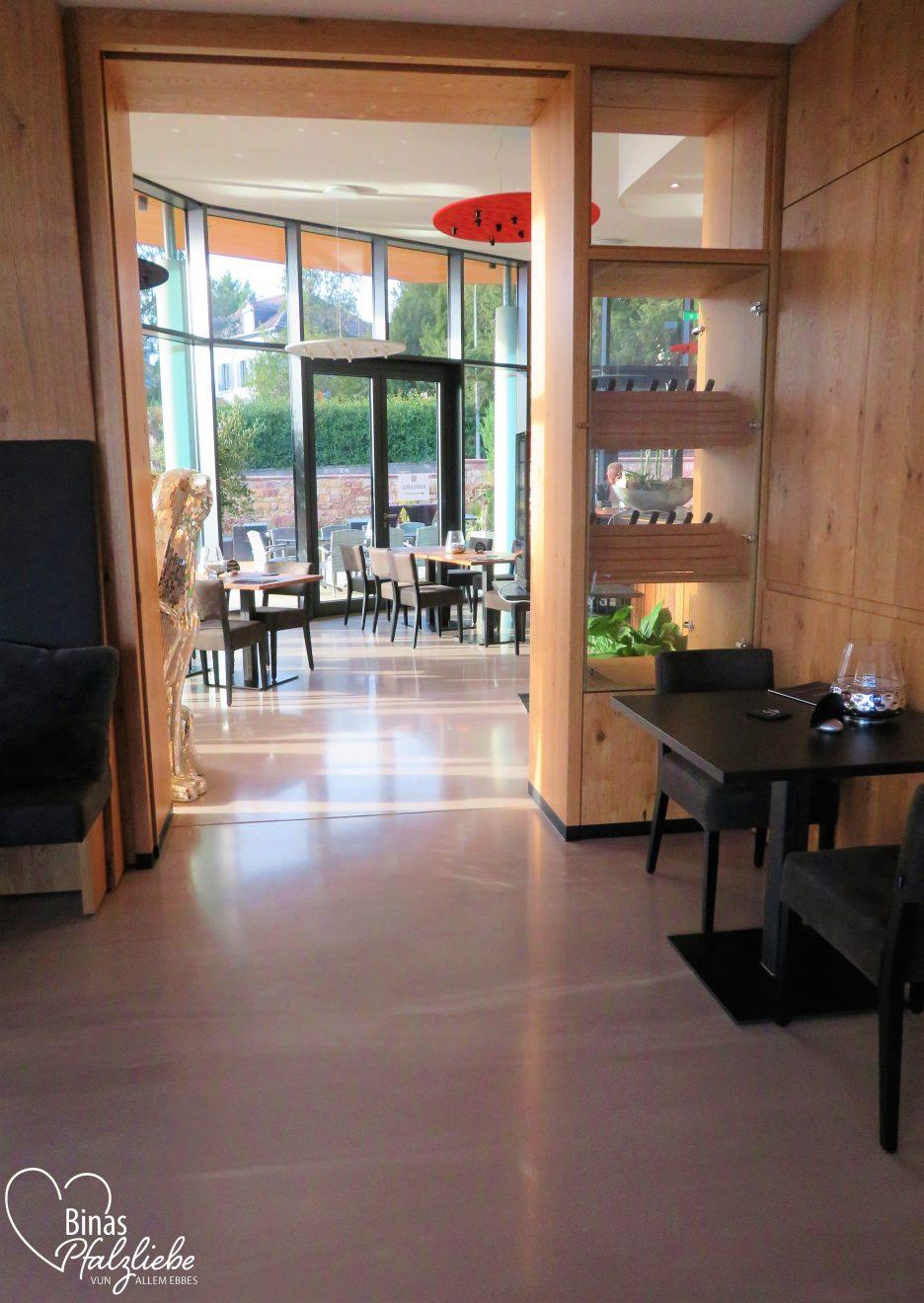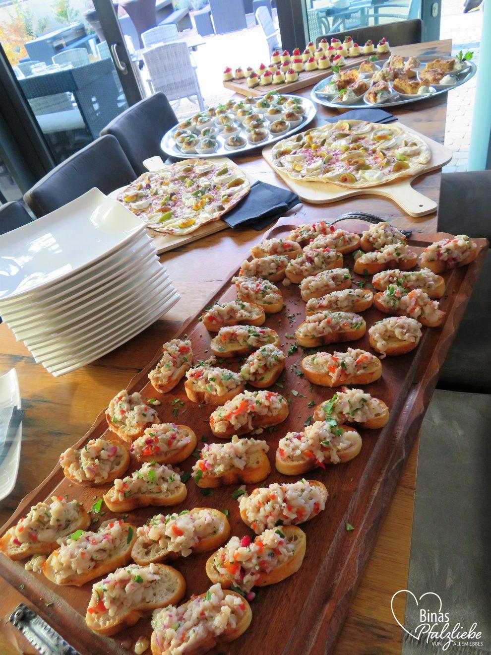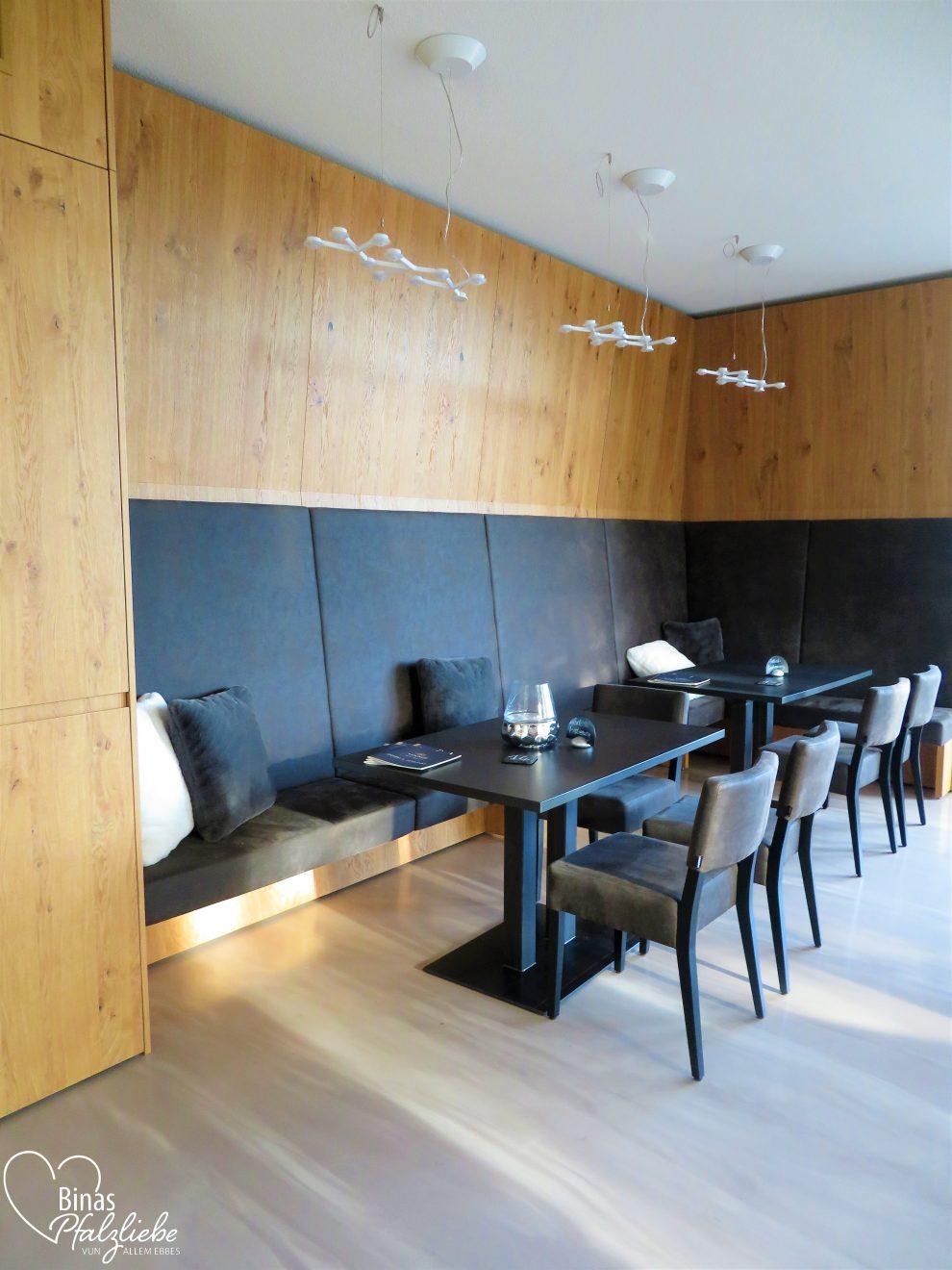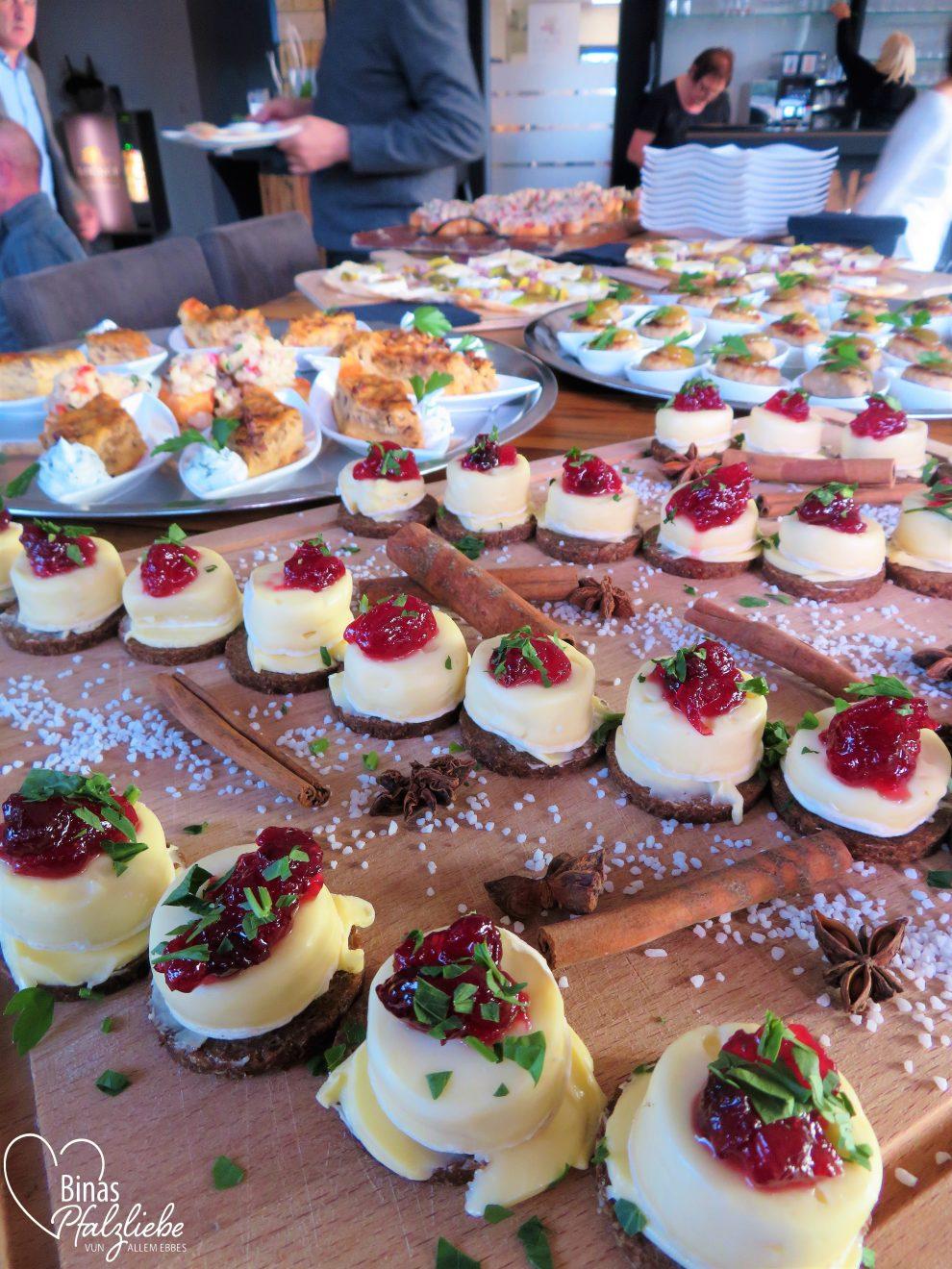Drinnen warteten schon die Häppchen auf uns, die der Koch des Hauses (der lustigerweise auch mit Nachnamen Koch heißt) für uns vorbereitet hatte. Es gab Forellentatar-Crostinis, Flammkuchen mit Feigen und Camembert, kleine Fleischküchle mit Feigensenf, Zwiebelkuchen und Pumpernickel mit Camembert und Preiselbeeren – alles wunderschön angerichtet und superlecker! Auf der Speisekarte stehen neben Pfälzer Gerichten und Flammkuchen auch verschiedene Ofenkartoffel-Variationen. Für mich als Grumbeer-Liebhaberin nur einer von vielen Gründen wiederzukommen.