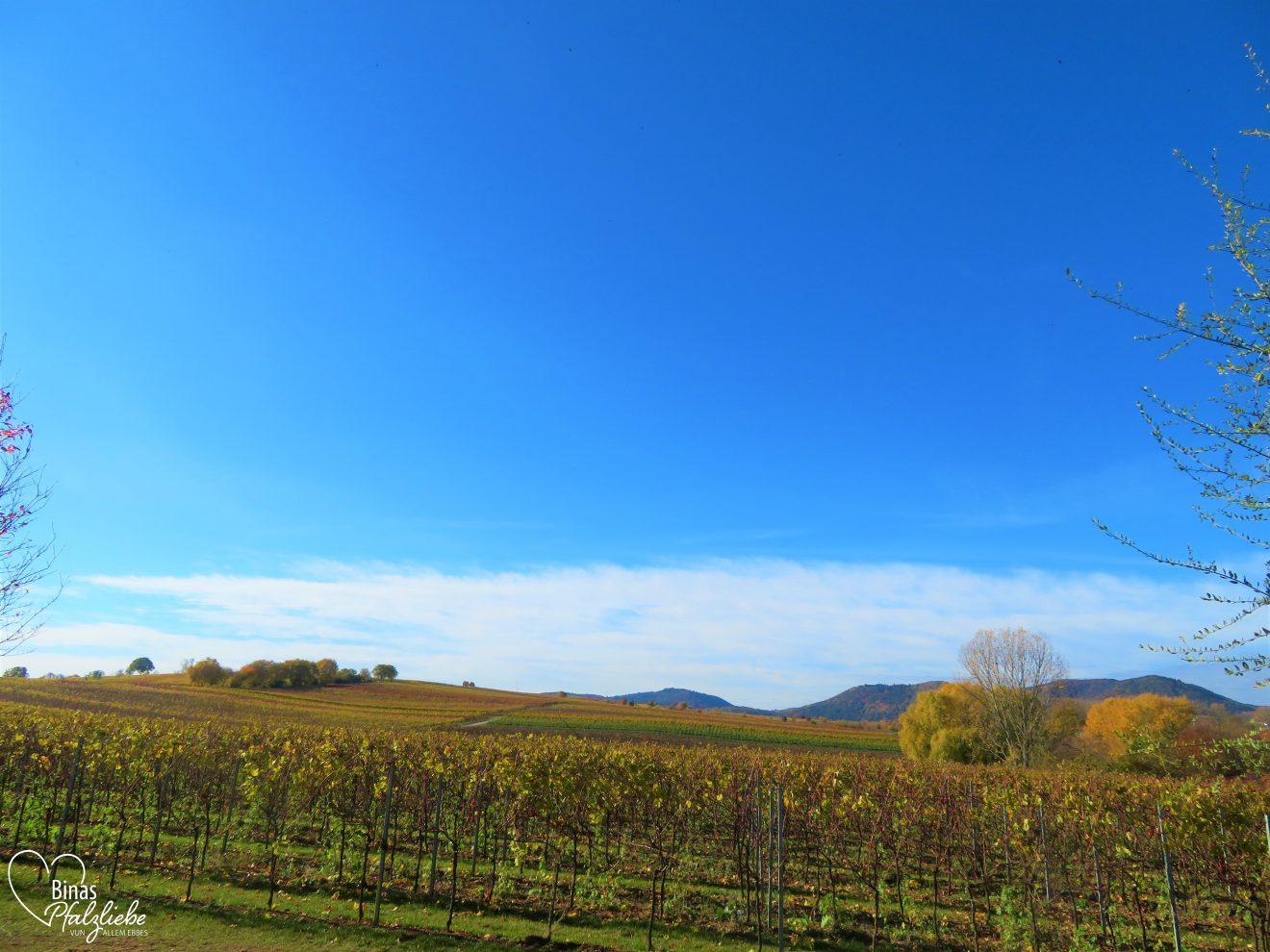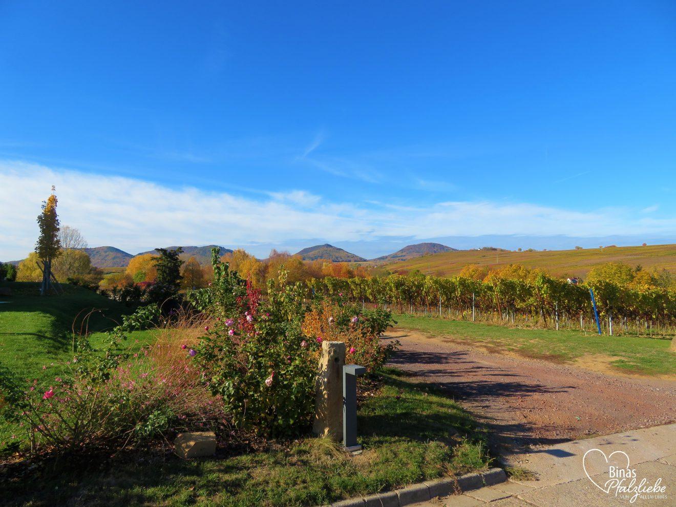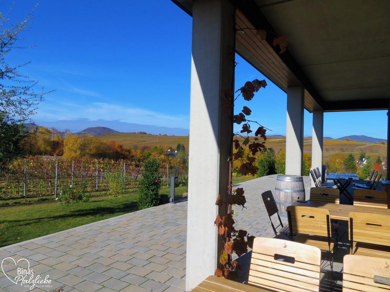 Die Aussicht ist der absolute Wahnsinn und das bei jeder Jahreszeit: ob in den sonnigen Sommermonaten, im Herbst, wenn sich die Blätter färben, oder im Winter, wenn alles draußen mit Schnee bedeckt ist – es gibt immer etwas zu sehen. Vor einem erstreckt sich ein weites Rebenmeer, man schaut auf die Madenburg, die Kleine Kalmit, die Ausläufer der Haardt und in der Ferne kann man bis zum Hambacher Schloss sehen. Reben, Wälder, Berge, Burg und Schloss – was will man mehr?!