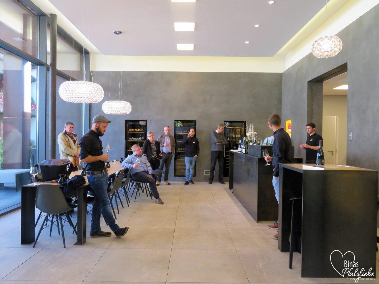 Der Proberaum zeichnet sich durch graue Wände in Betonoptik mit Holzelementen aus. Die Weine werden in hinterleuchteten Wandnischen präsentiert und auf der langen Theke warteten bereits die guten Tropfen, die wir verkosten durften.