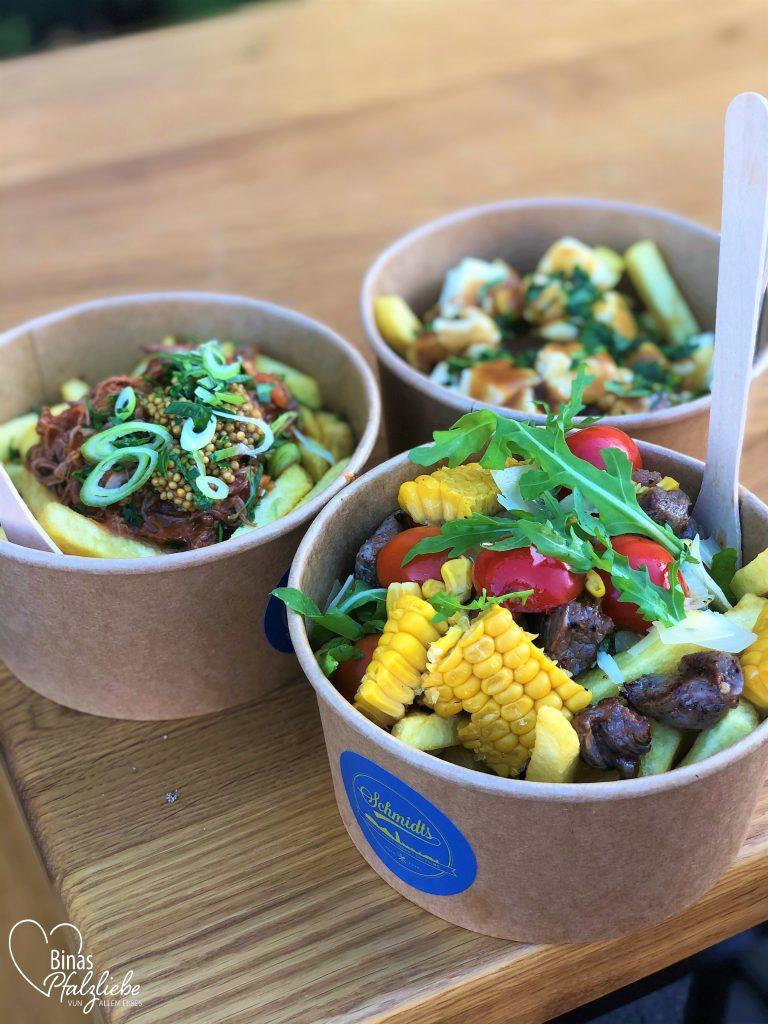 Das Publikum ist bunt gemischt und die Atmosphäre locker und ungezwungen. So spricht auch nichts dagegen, sich aus der benachbarten Schmidts Streetfood-Küche ein paar leckere Bowls zu holen, und sie am Weinkisten-Tisch zu genießen – einfach unkompliziert.